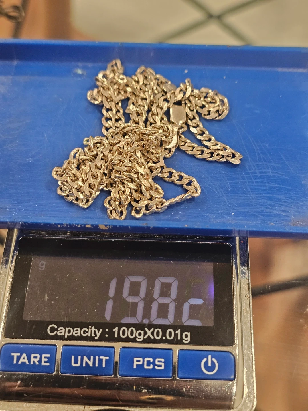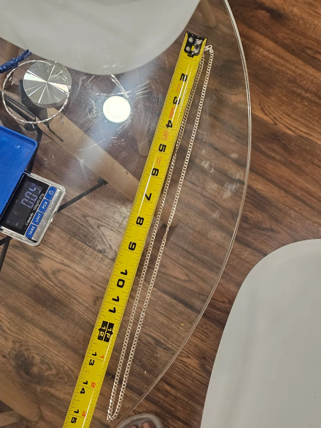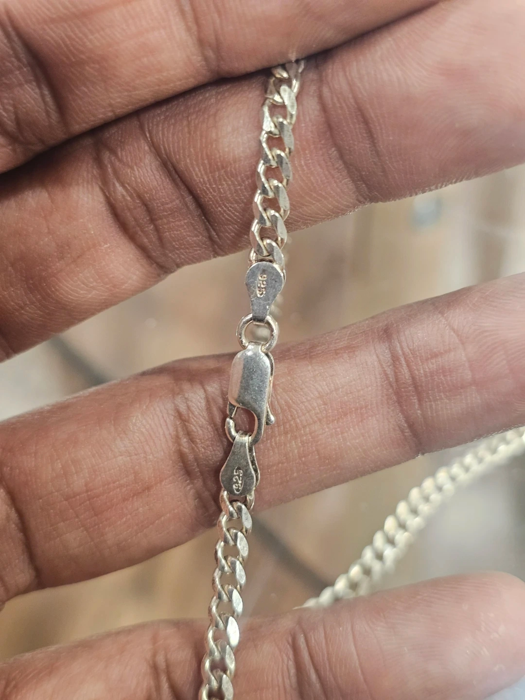 A classic sterling silver curb chain necklace. It's 30 inches long and weighs 19.8g. The clasp is marked "925". This necklace is great for everyday wear or layering with other pieces.