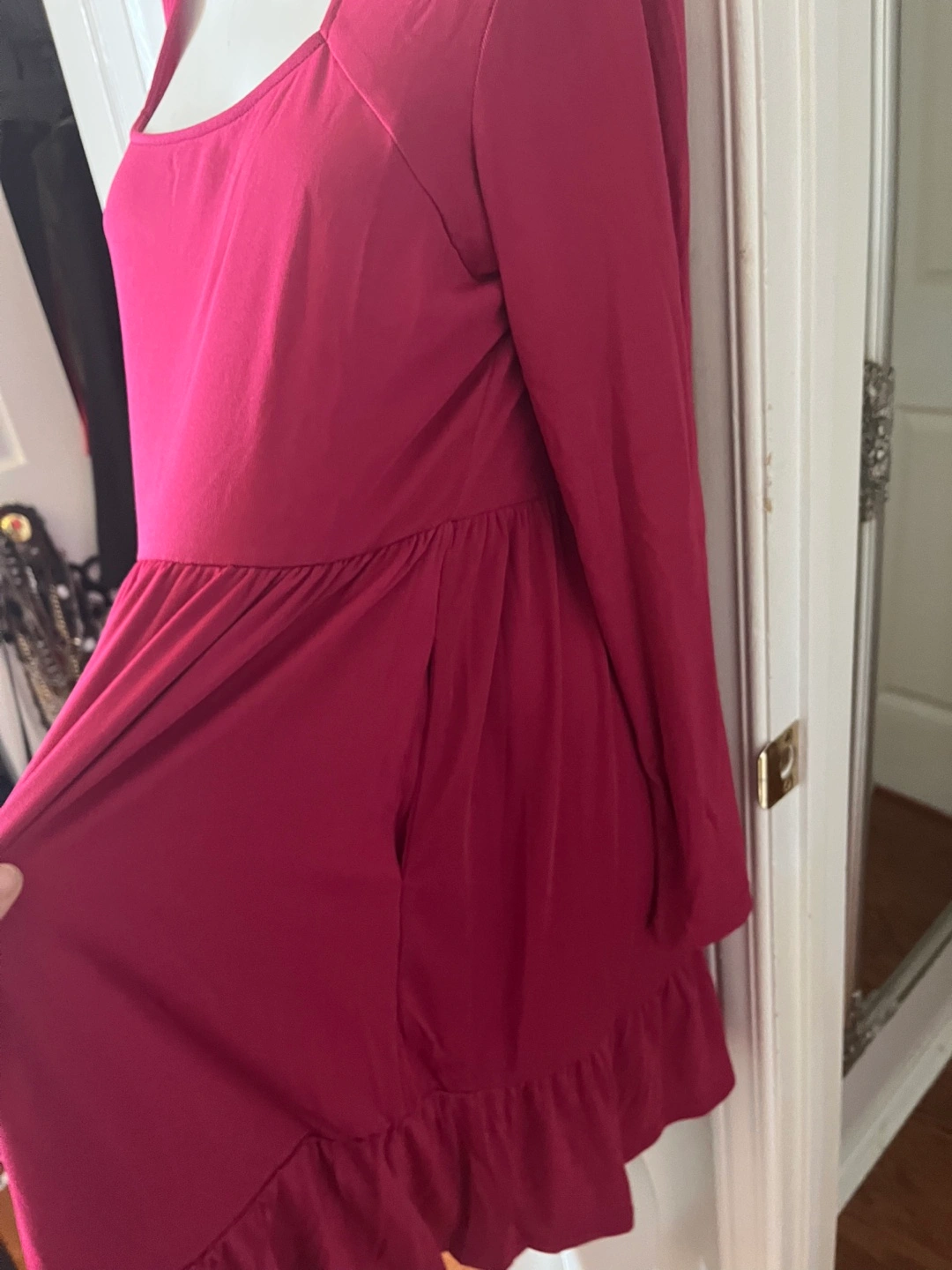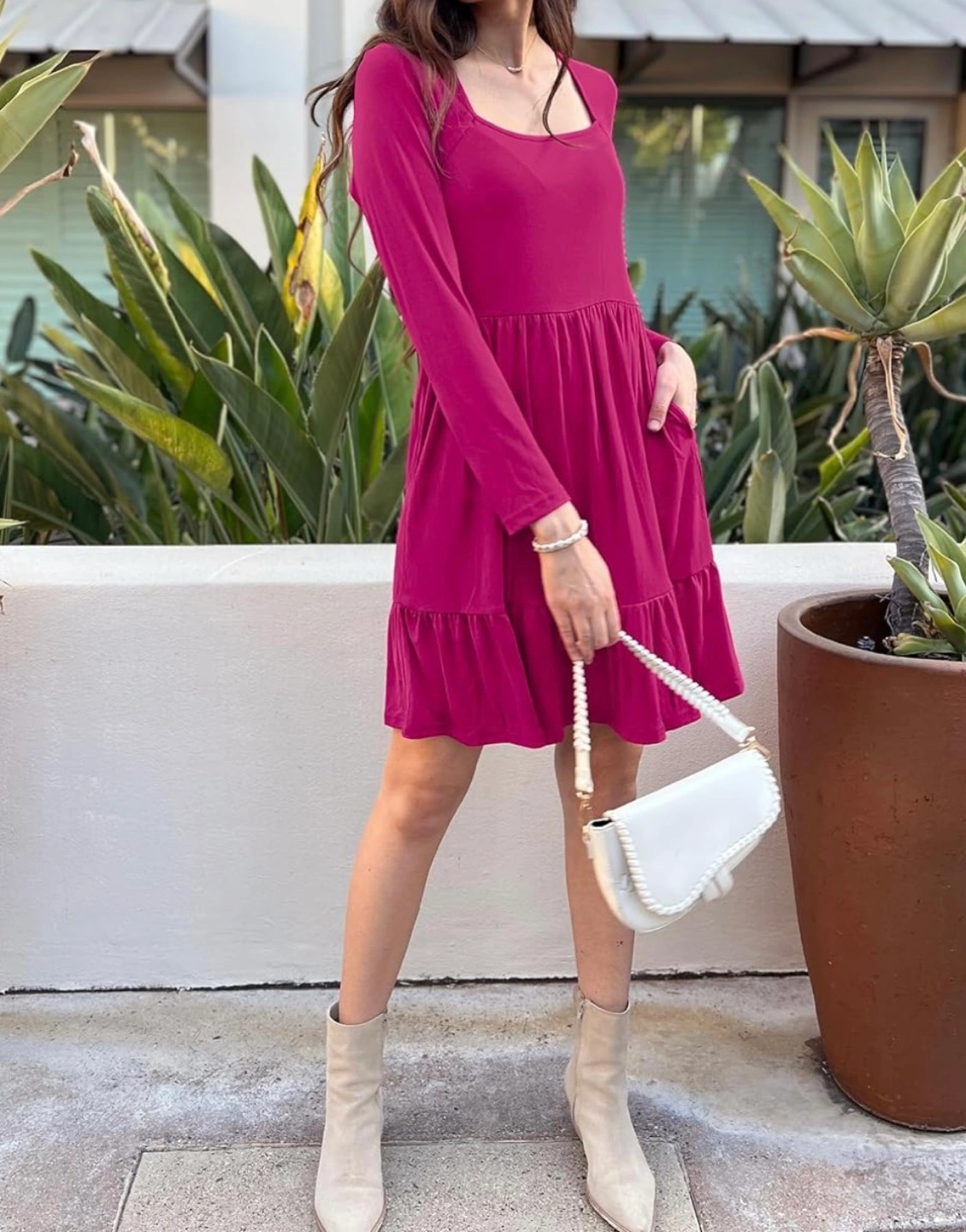 This Newshows dress features long sleeves and a tiered ruffle hem. It's a size XL with a comfortable fit. The square neckline adds a stylish touch.