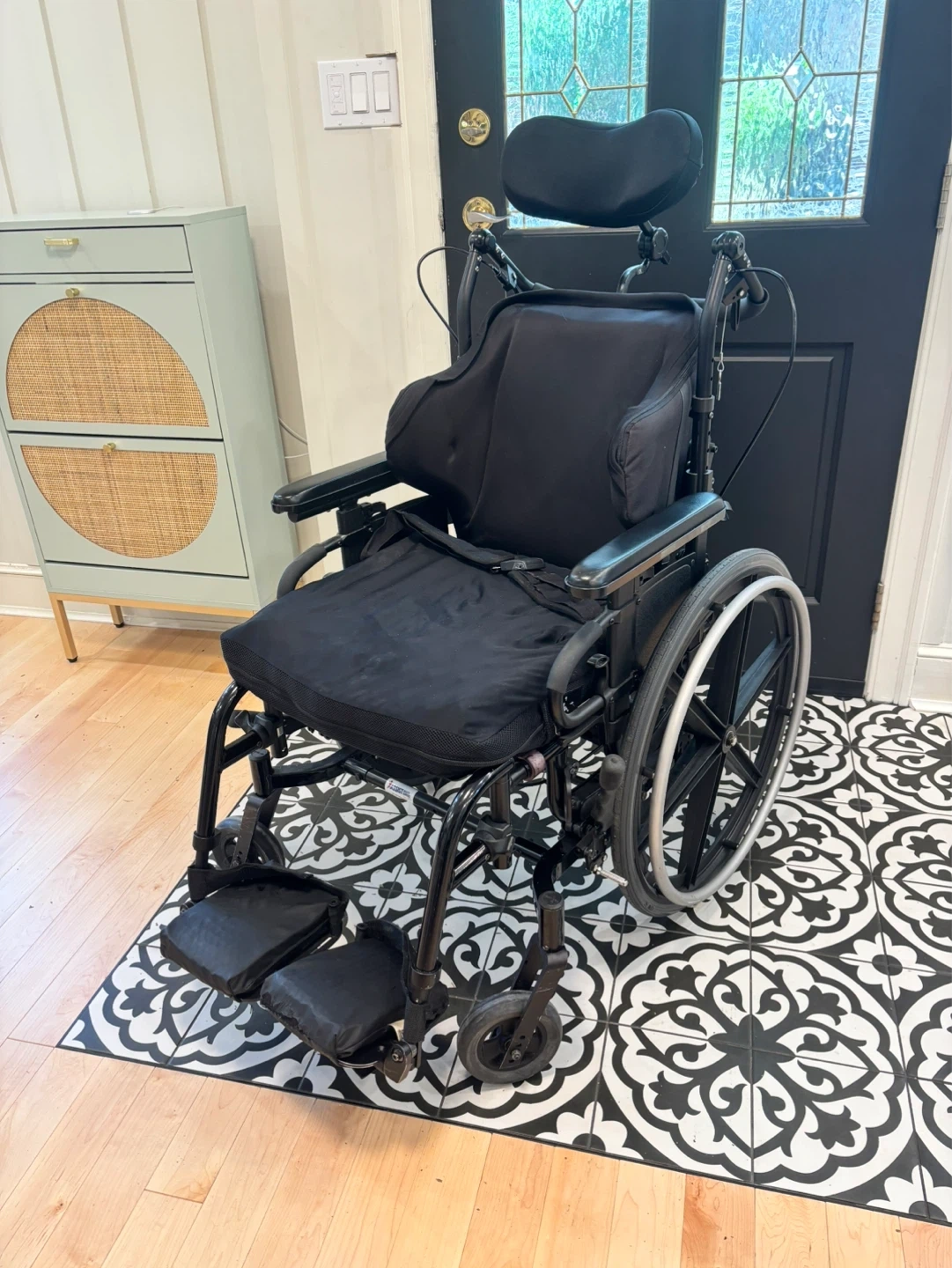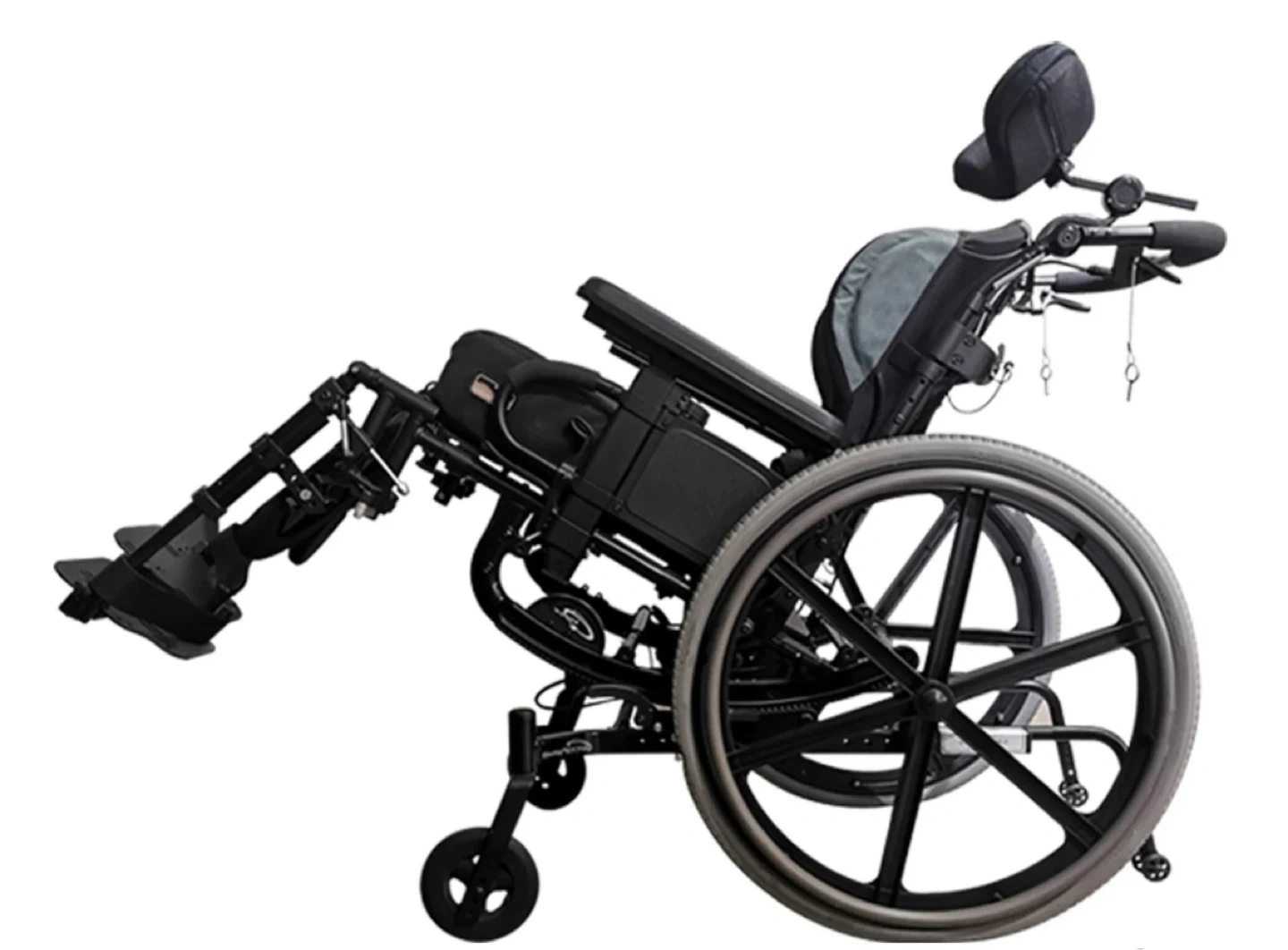 This is a high-quality tilt-in-space wheelchair designed for comfort, pressure relief, and positioning support.