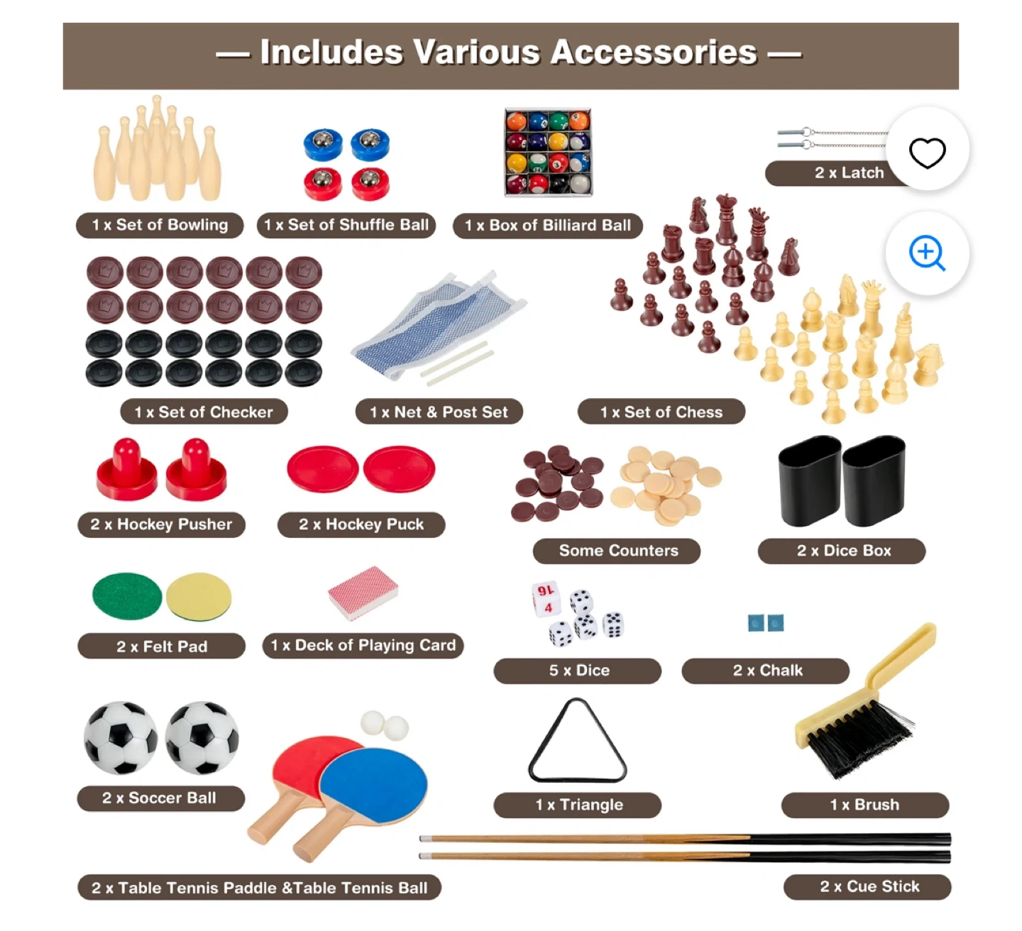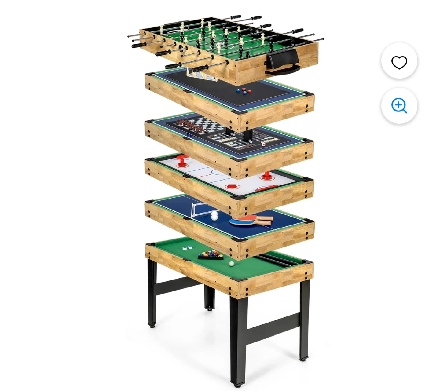 This multifunctional game table offers a wide variety of games for hours of fun. It includes accessories for bowling, shuffle ball, billiards, chess, checkers, hockey, table tennis, foosball, and more. It's a great way to entertain friends and family with its versatile play options!