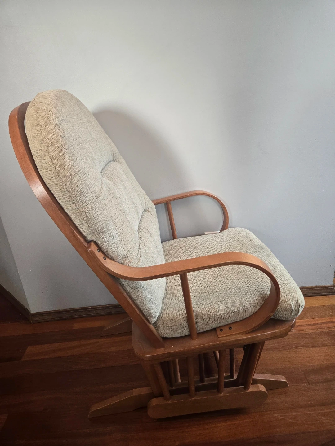 Comfortable glider rocker chair with wooden frame. Upholstered in a textured beige fabric. This chair is designed for gentle rocking motion.