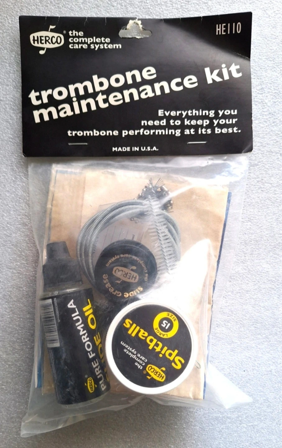 Here's a Herco trombone maintenance kit! It's everything you need to keep your trombone performing at its best. The kit includes Herco pure formula slide oil, slide grease, and spitballs (large size 15). Made in the USA