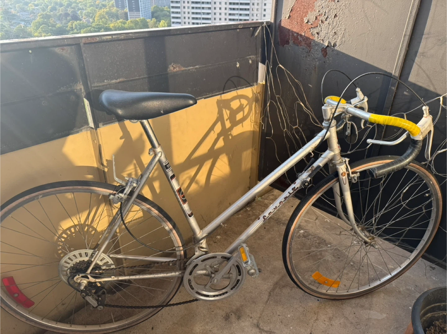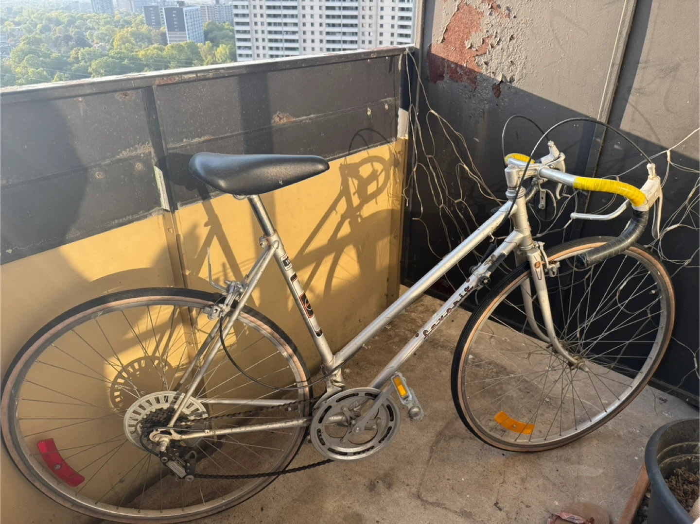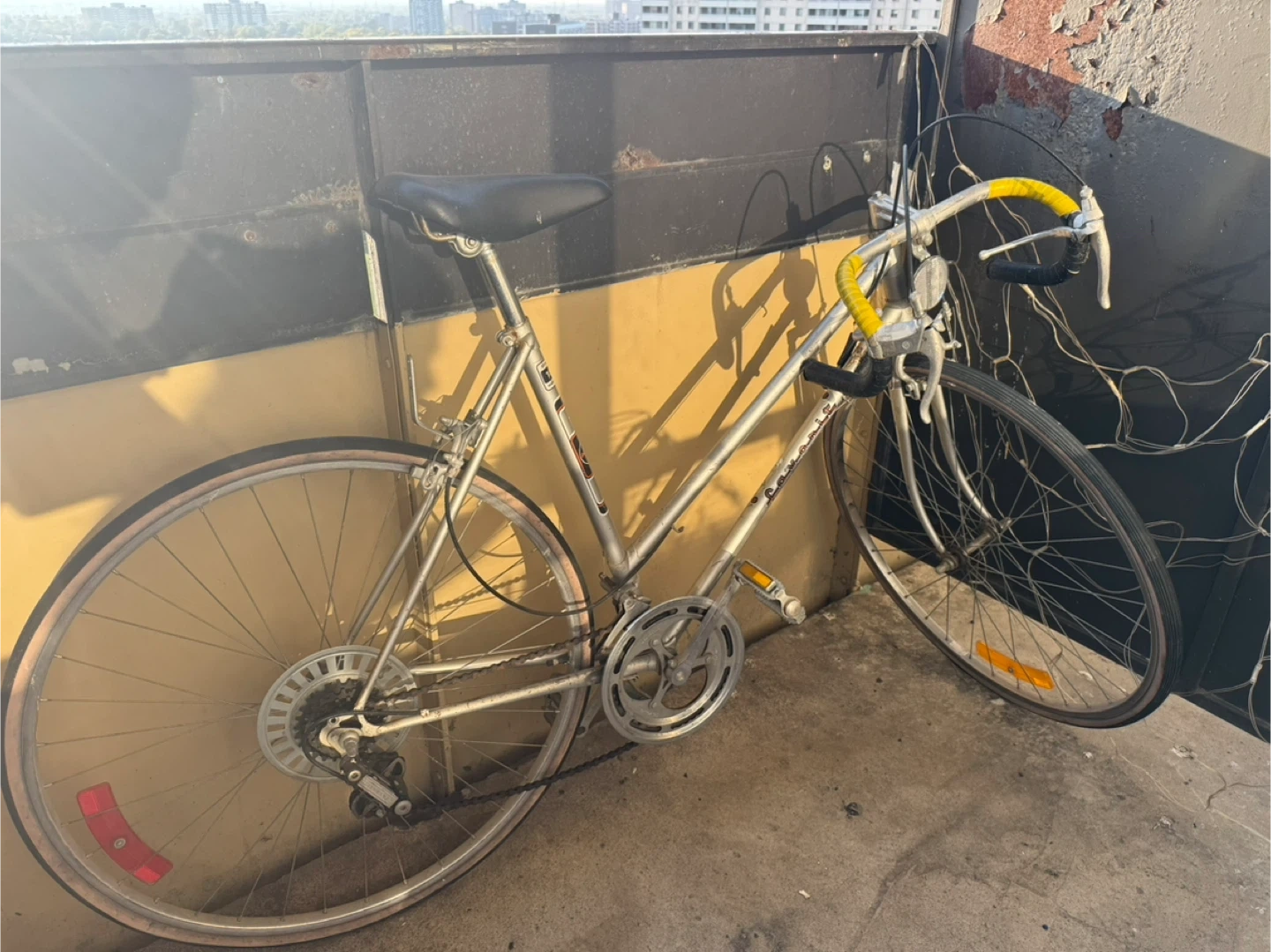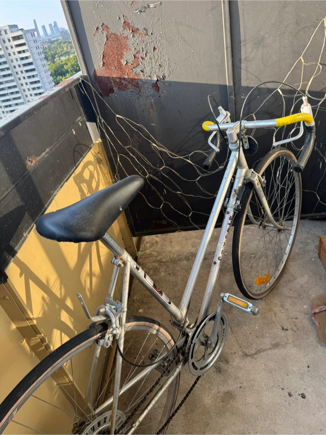 Selling a road bike in silver. It has yellow handlebar grips and a black seat. A great bike for cruising around town!