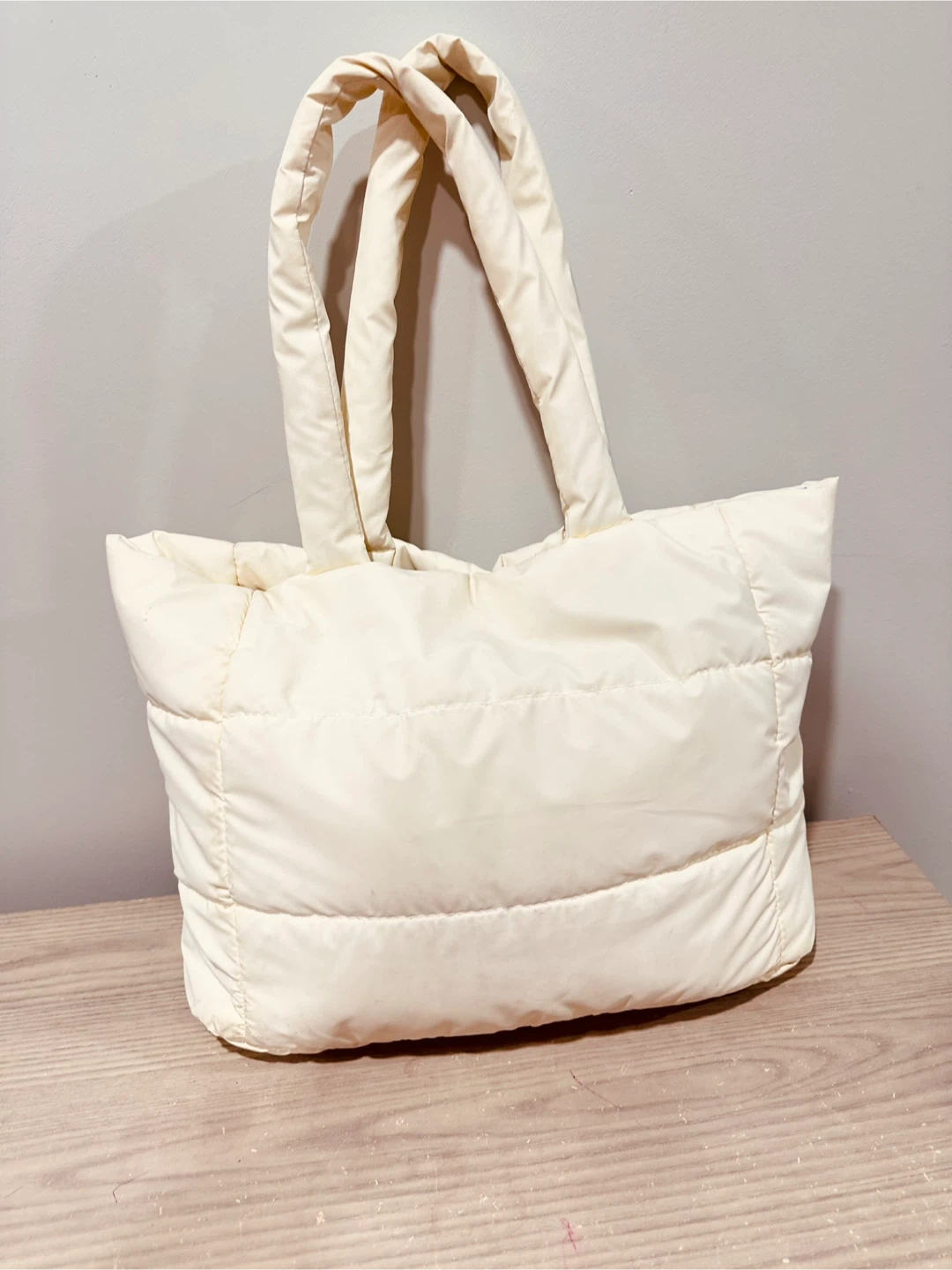 A stylish cream puffer tote bag with comfortable shoulder straps. Its padded design makes it a chic accessory for everyday use. Great for carrying your essentials in style!