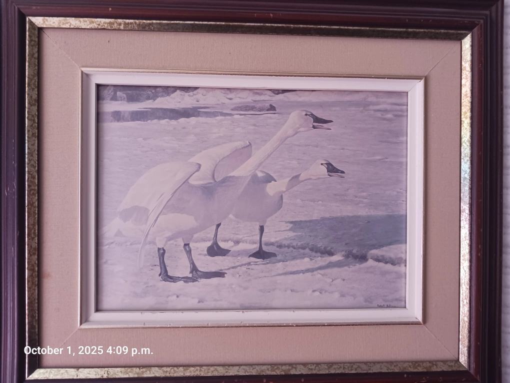 Selling a framed Robert Bateman print featuring courting pair whistling swans. It's in great condition and ready to hang in your home. limited edition print.