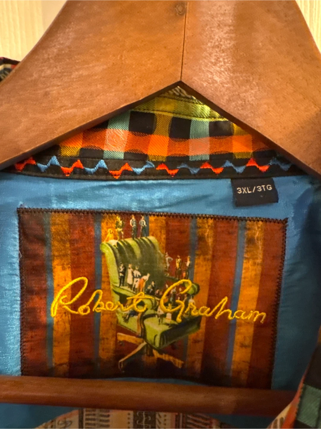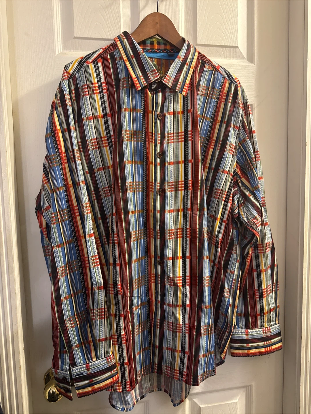 Selling a Robert Graham button-down shirt in size 3XL/3TG. It has a colourful and unique design. Perfect for adding a pop of colour to your wardrobe!
