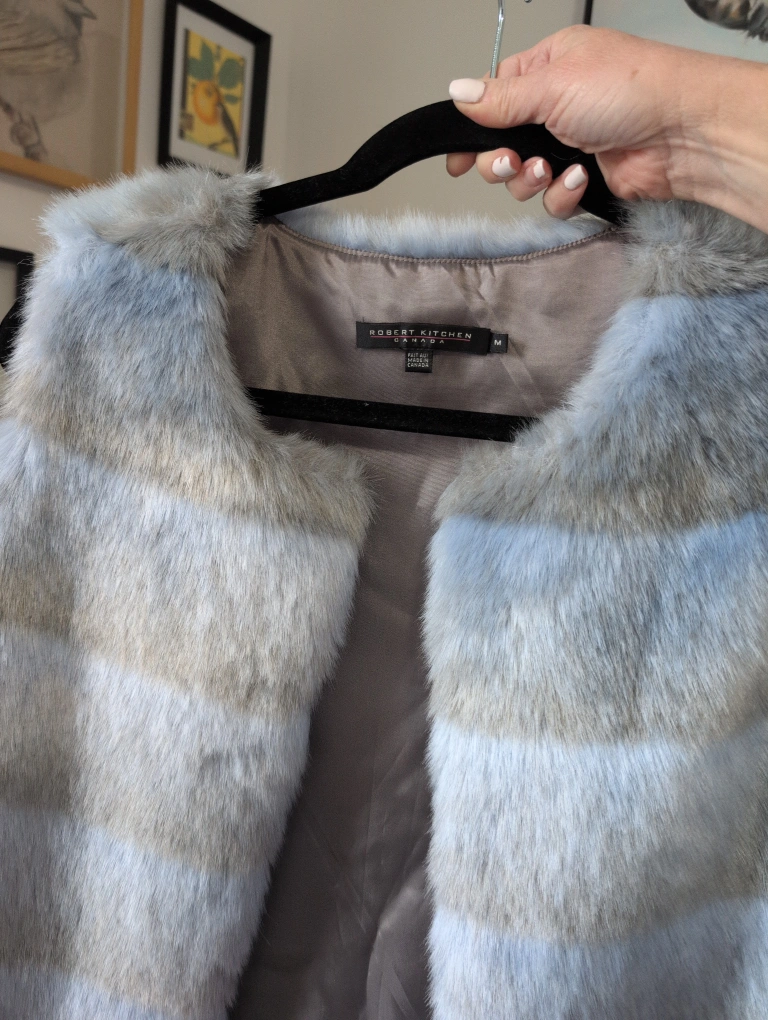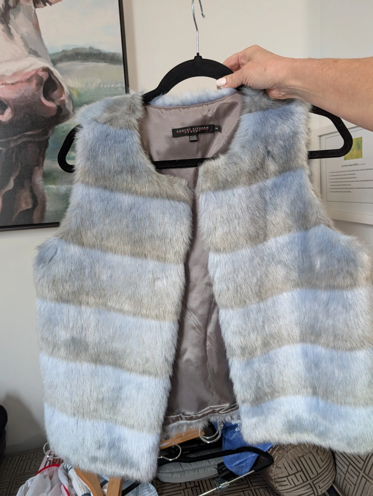 226Here's a stylish faux fur vest from Robert Kitchen! It's a size M and features a lovely blend of grey and blue tones. Perfect for adding a touch of warmth and flair to any fall outfit. It's lined and ready to be added to your fall wardrobe. 22" long and 21.5" from p to p.