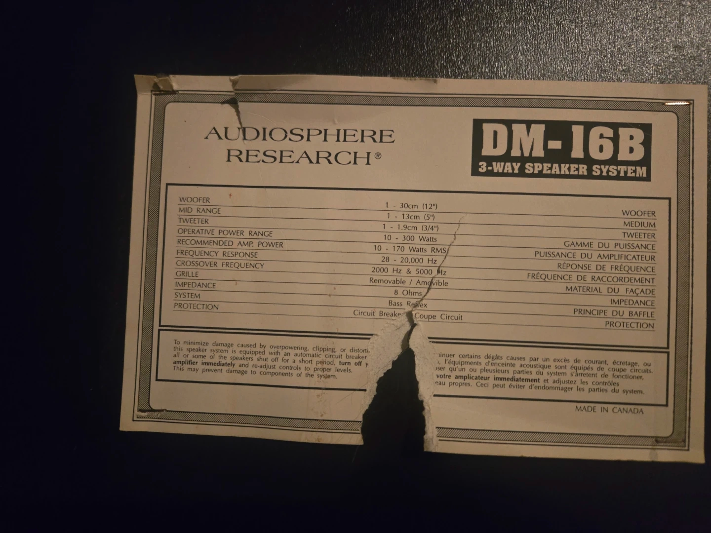 This is an Audiosphere Research DM-16B speaker system. It features a 1-30cm (12") woofer, 1-13cm (5") mid-range, and a 1-1.9cm (3/4") tweeter. The recommended amp power is 10-300 Watts, with a frequency response of 28-20,000 Hz. It's a 3-way speaker system with a removable/ambidextrous grille and 8 Ohms impedance.
