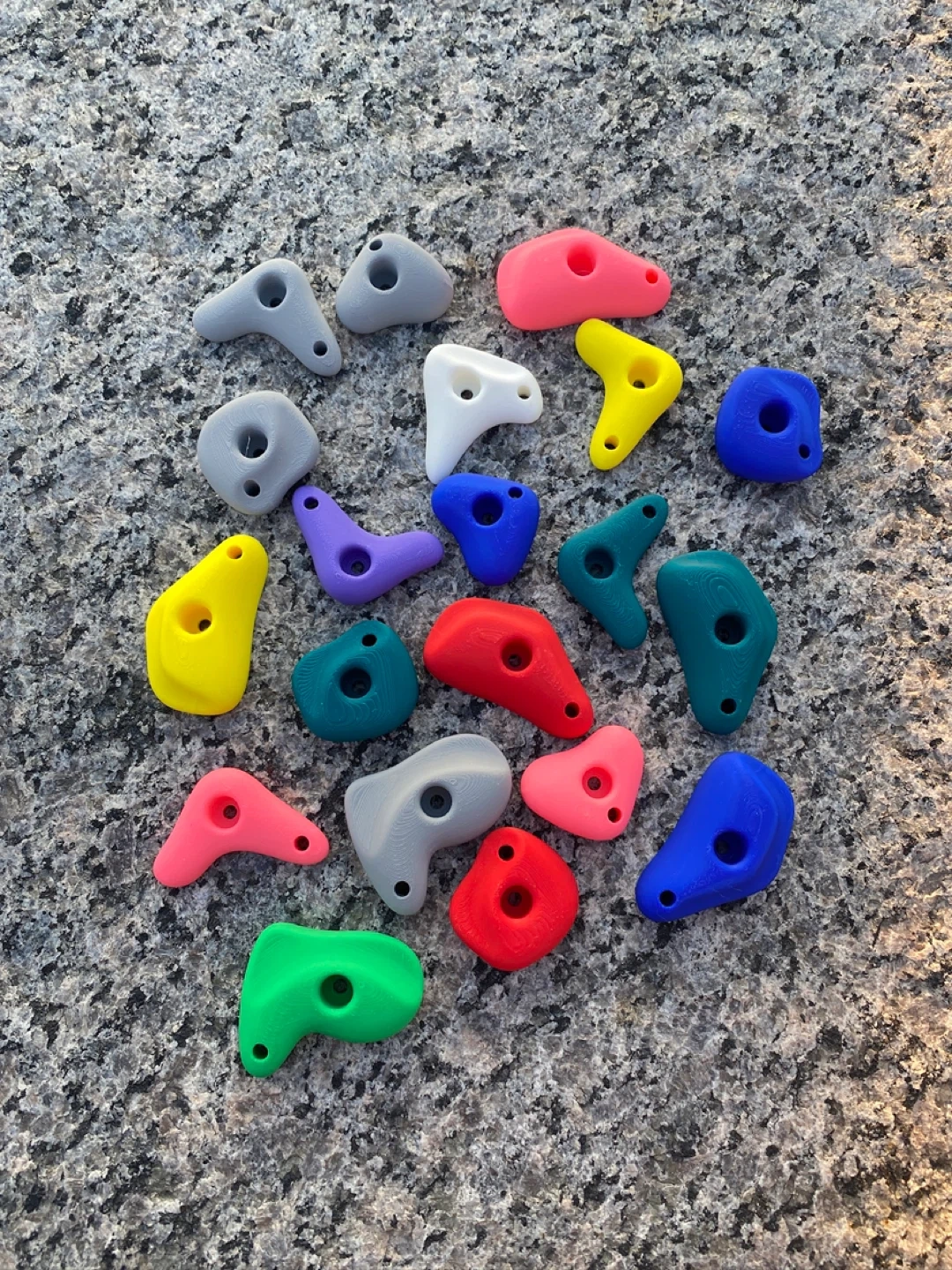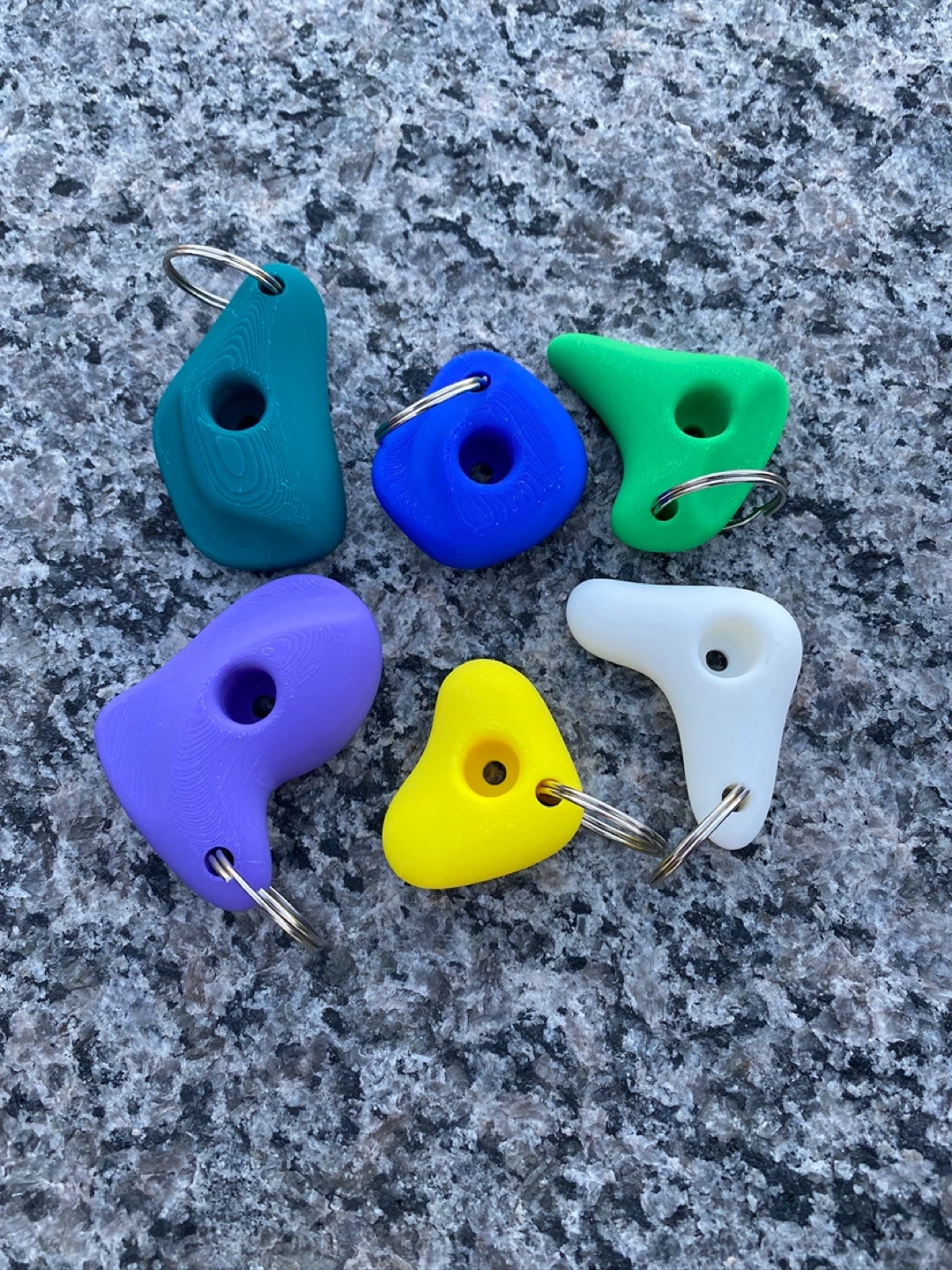48Rock climbing holds sized down to use as sturdy keychains. Been giving these out at the gym and to rock climbing friends and they've been really popular. Mine's been on my keychain for a year and shows no sign of wear. Selling a set of 6 unique shapes for $10. Shipping available.