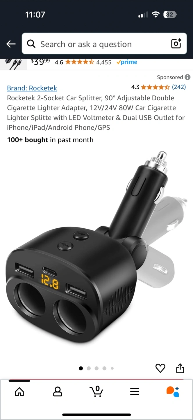75Dual USB outlet and cigarette lighter adapter. LED voltmeter. 12V/24V. 80W. For iPhone/iPad/Android phone/GPS. It works perfectly. Pick up Yonge&Sheppard