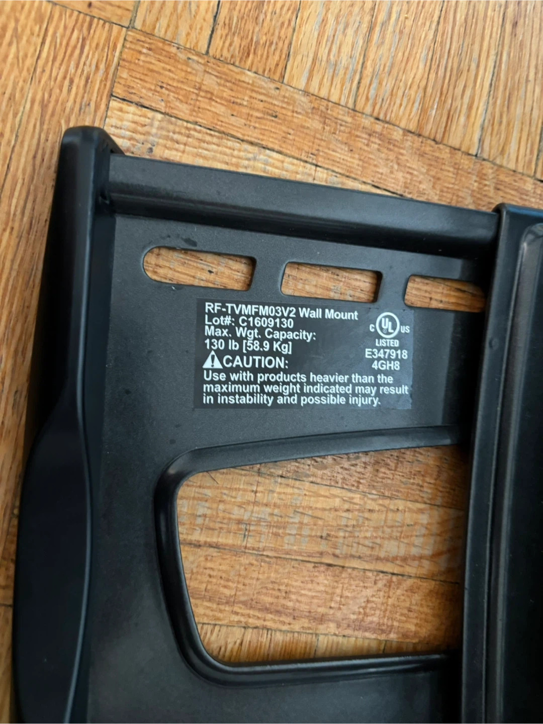 10Selling a Rocketfish RF-TVMFM03V2 wall mount. It has a max weight capacity of 130 lb (58.9 kg). Please use with products heavier than the maximum weight indicated may result in instability and possible