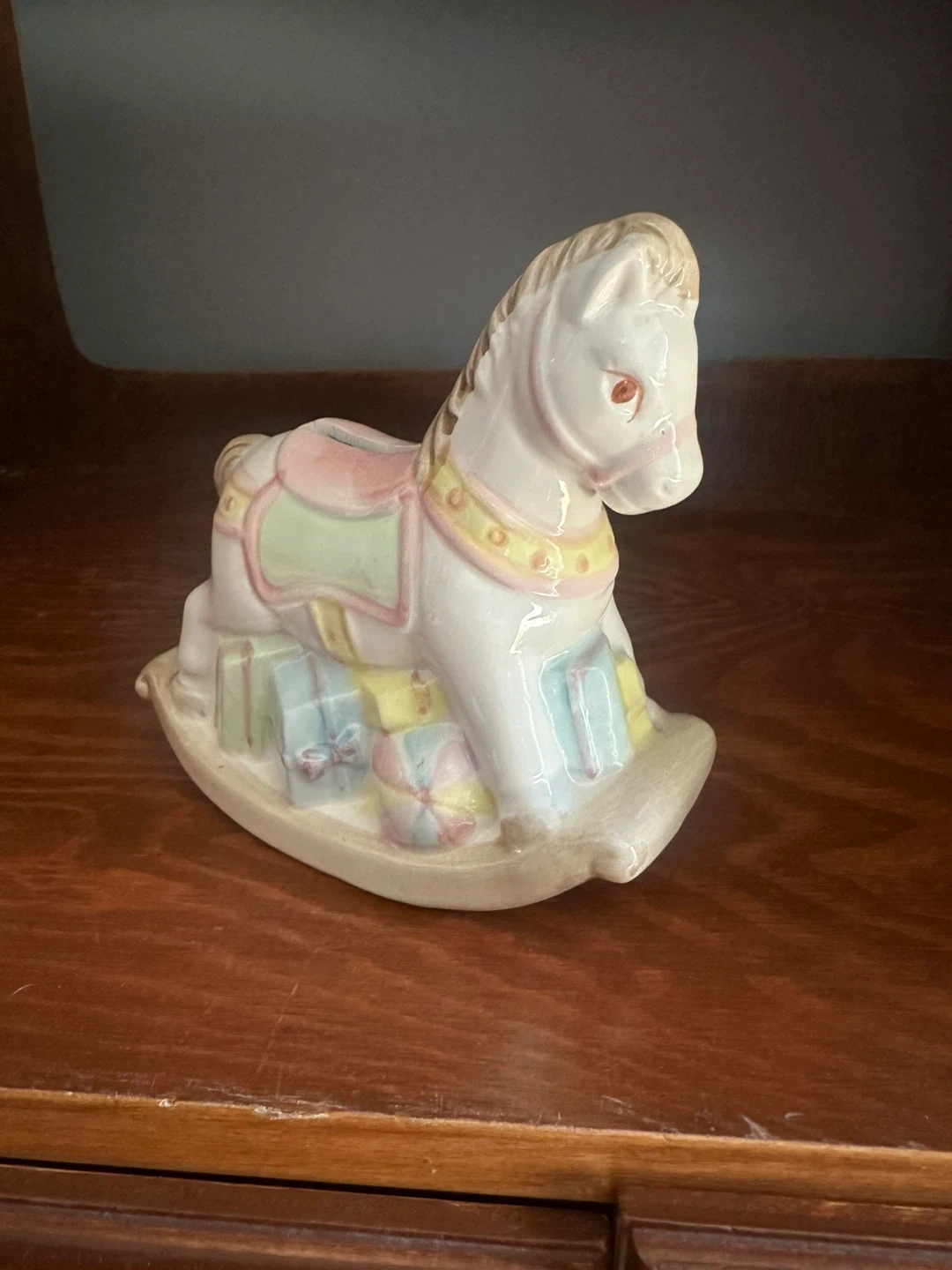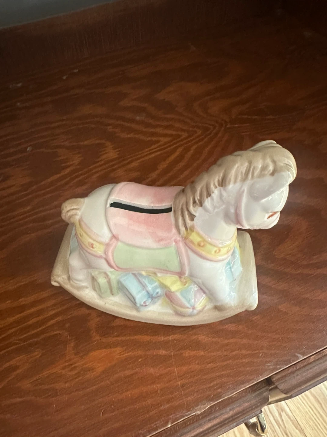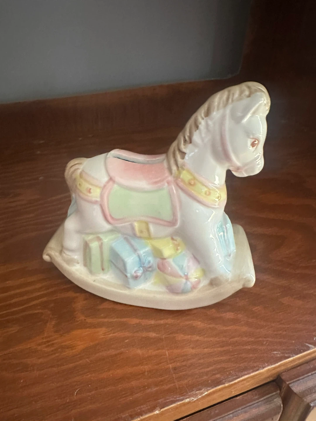 Here's a charming ceramic coin bank in the shape of a rocking horse! It's a delightful piece with pastel colours and a sweet design. Perfect for adding a touch of whimsy to any room or for teaching little ones about saving