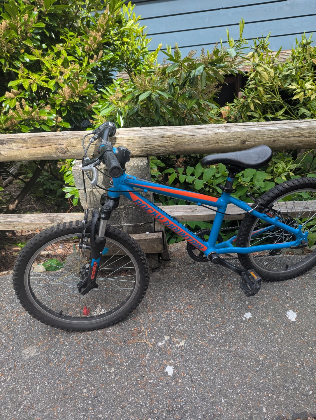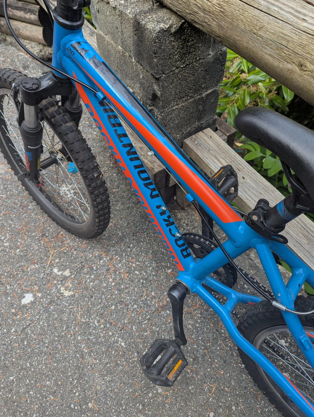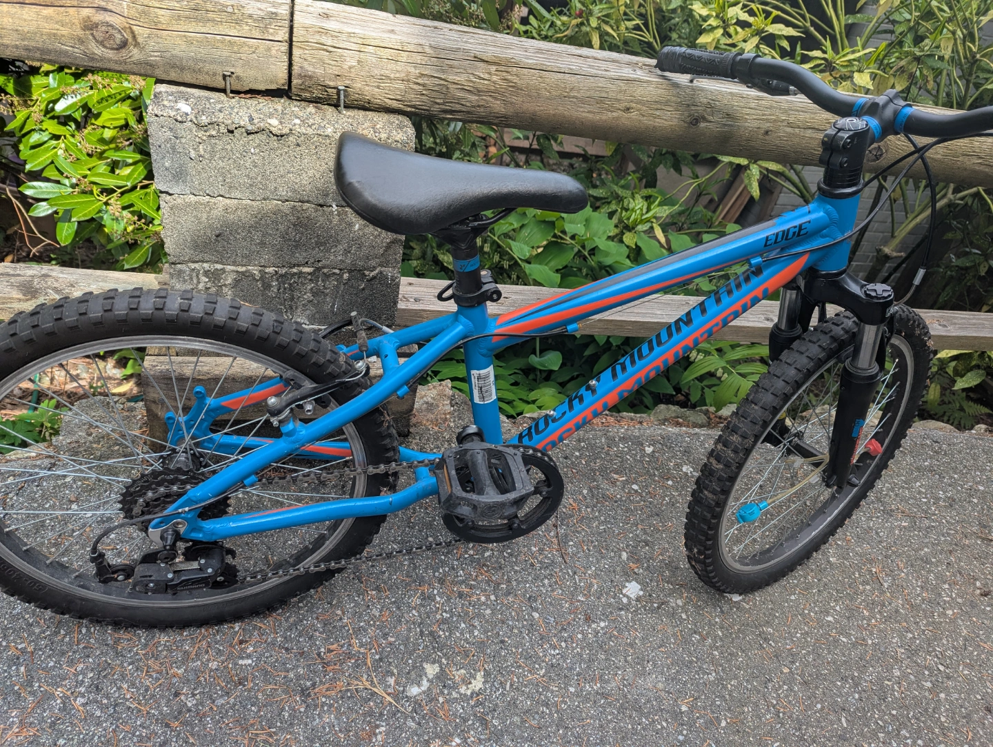 Blue and orange Rocky Mountain Edge kids bike. 20 inch wheels. Front suspension forks. Good used condition. cash only!