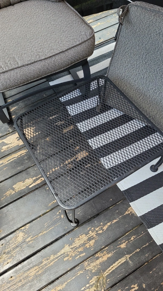 Very comfortable, solid rod iron chair with thick, grey cushions covered with durable, outdoor fabric. Perfect for relaxing on the deck or patio. Foot rest/side table, with matching cushion sold separately $40.00