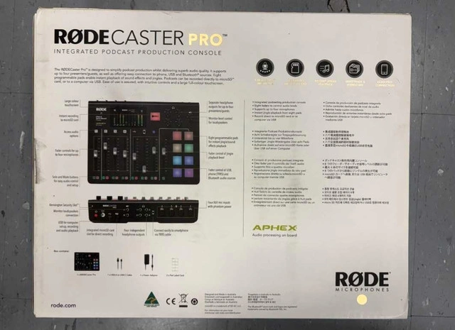 10The RODECaster Pro is the world's first fully integrated podcast production studio. Whether you are just starting out, or are a seasoned broadcast professional, the RODECaster Pro Podcast Production Studio is all you will ever need. Condition: New For Sale By: Owner