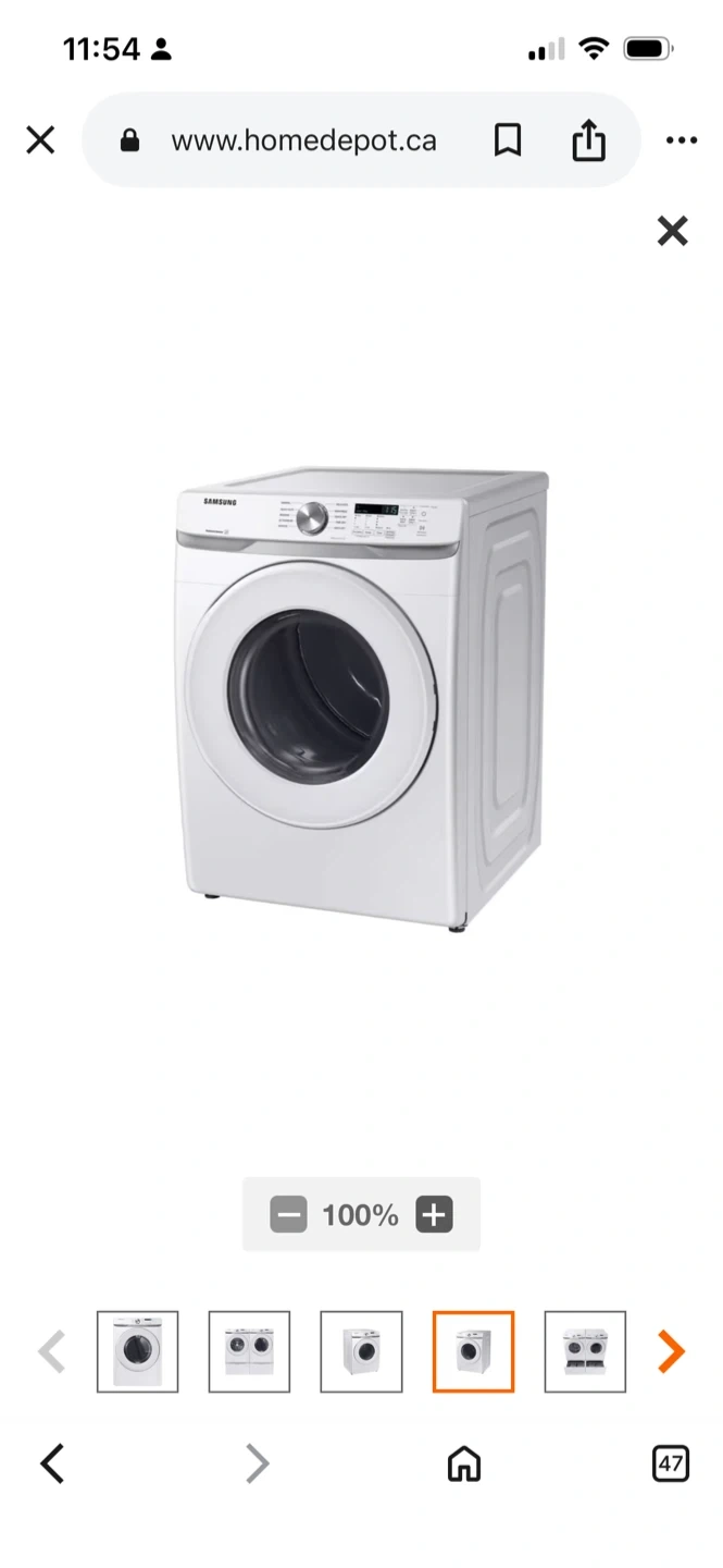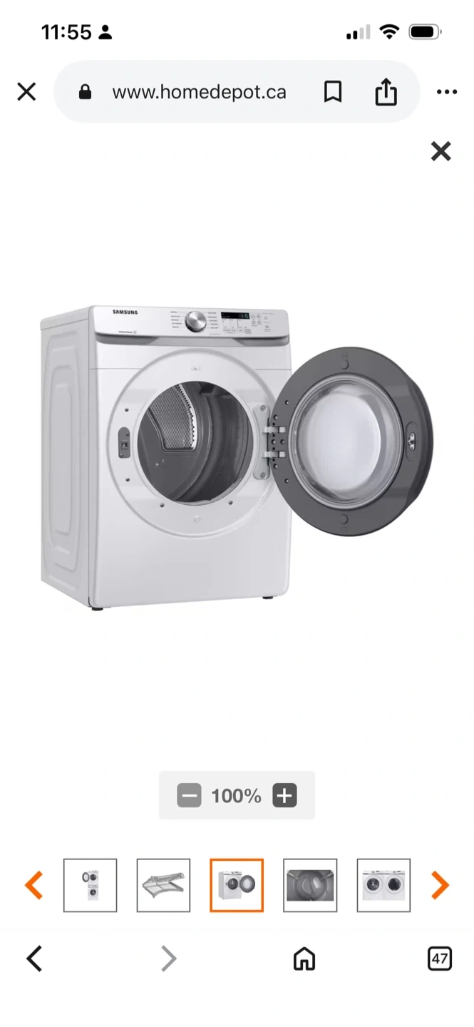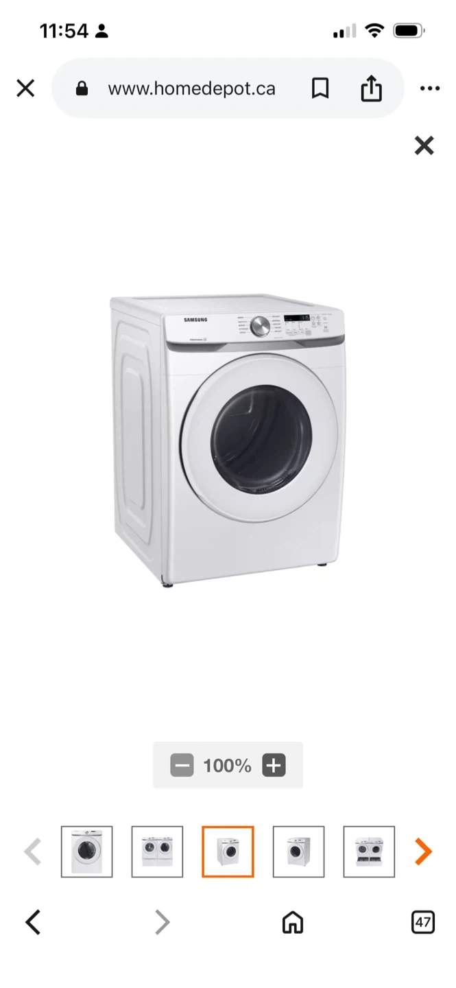 This is a white Samsung clothes dryer. It has a large capacity drum for all your laundry needs. The control panel is user-friendly and offers multiple drying cycles.