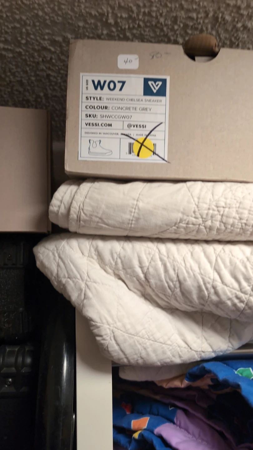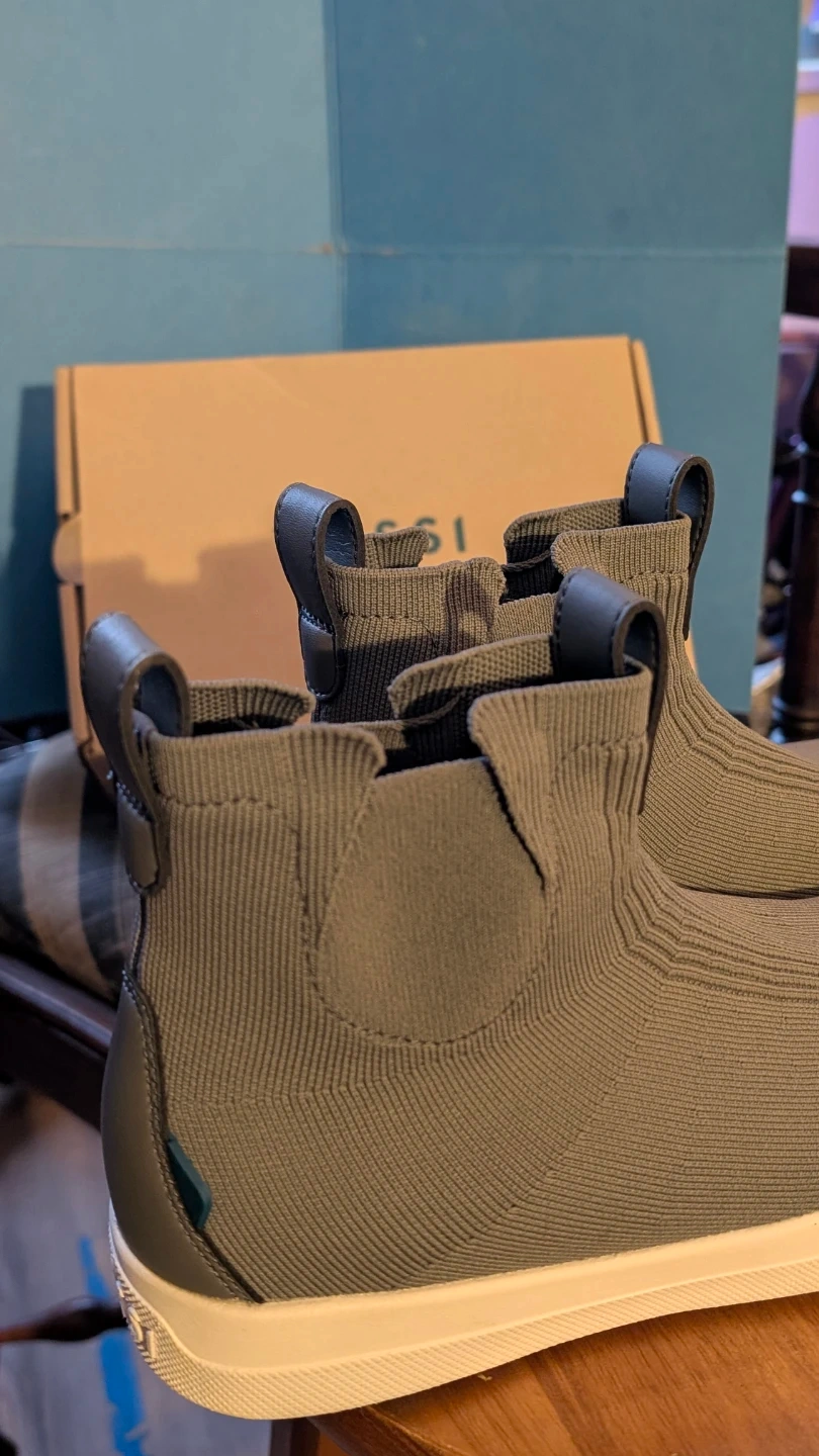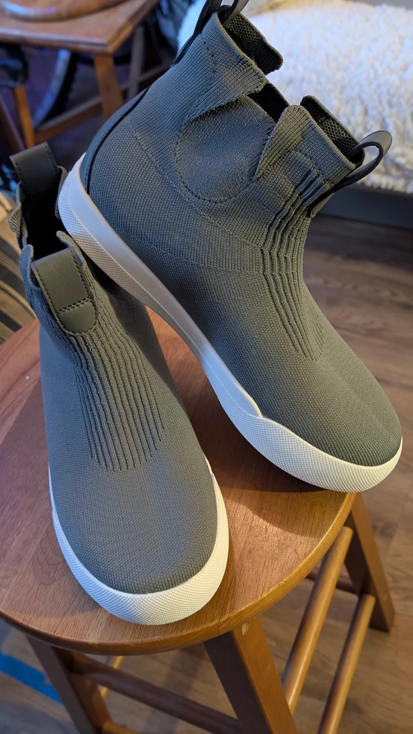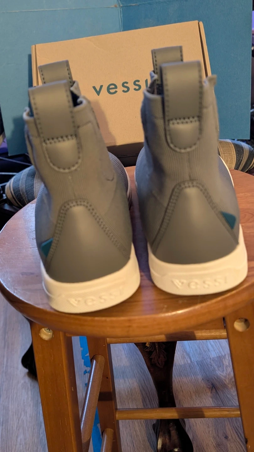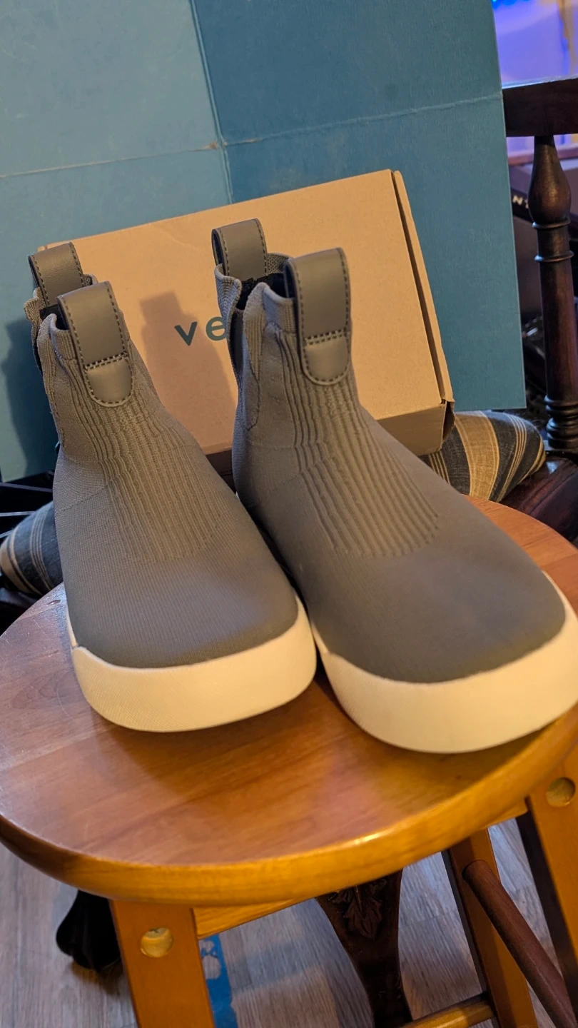 These Vessi W07 Weekend Chelsea sneakers are concrete grey. They feature a knit upper and waterproof construction. The shoe's size is 7.