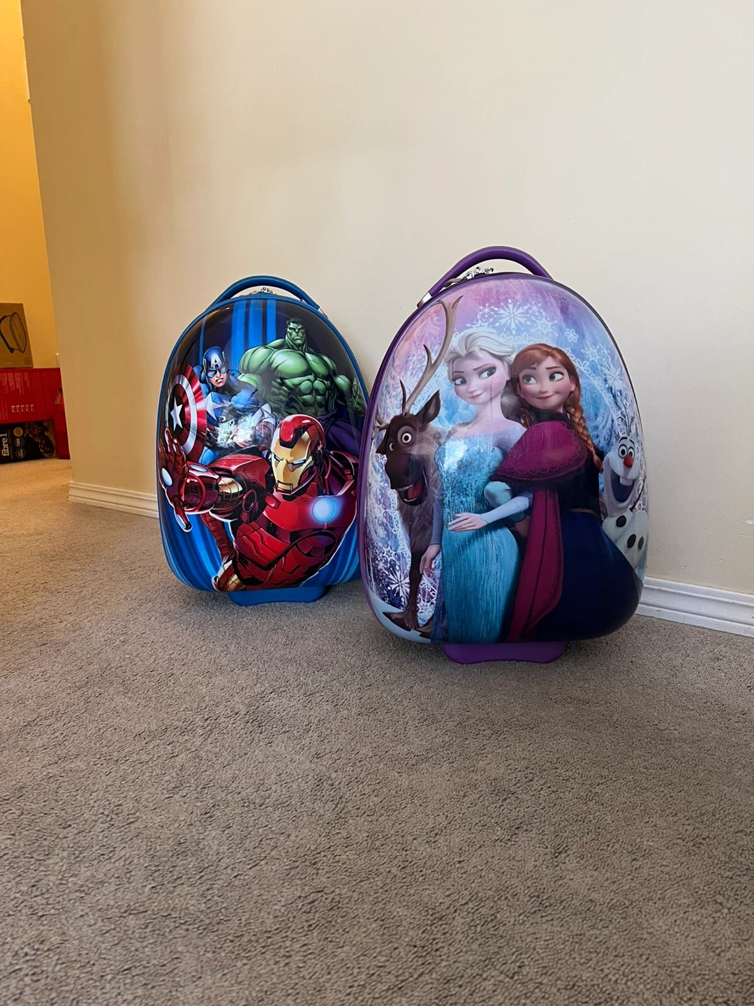 This set includes two fun kids' suitcases, one featuring Elsa and Anna from Frozen and the other with Marvel superheroes. They're perfect for little travellers to pack their own gear for trips. Each suitcase has a durable shell and secure zipper closure.