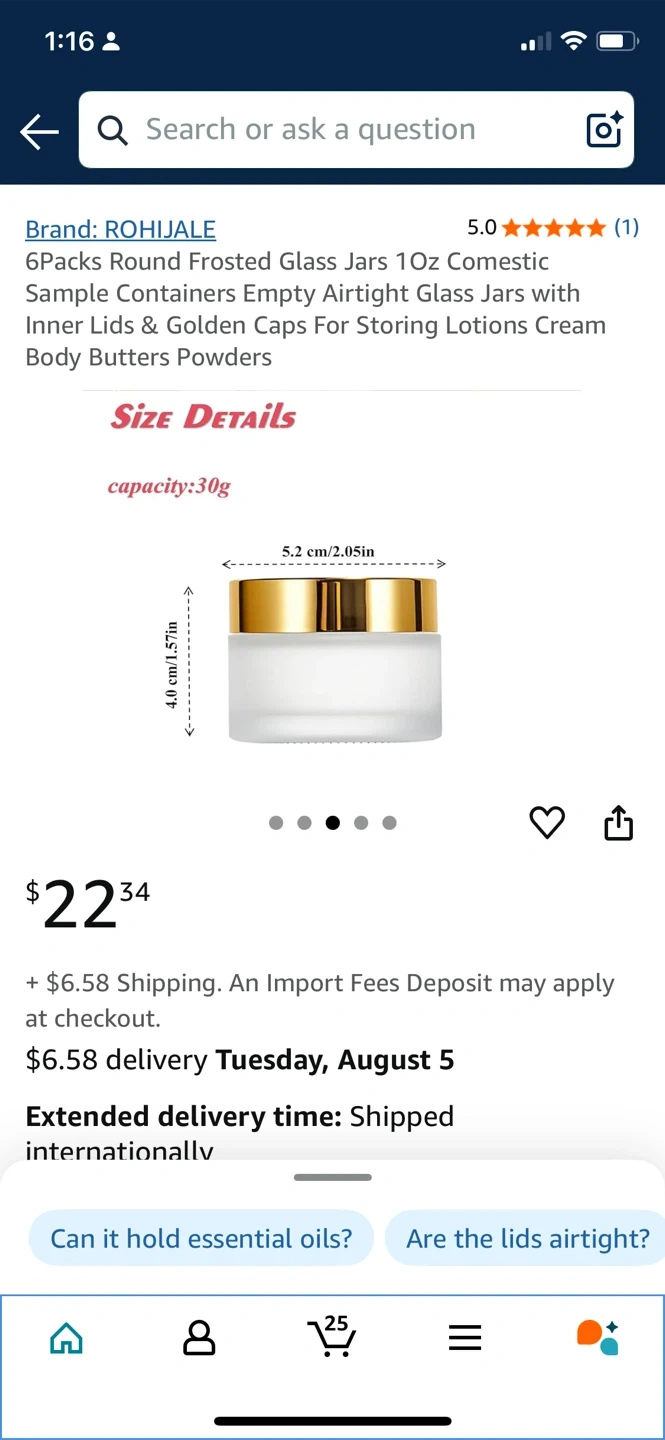 5Selling a set of ROHIJALE frosted glass jars! They're perfect for storing lotions, creams, body butters, or even essential oils. These jars are 1oz in size and come with inner lids and golden caps for an airtight seal. Capacity: 30g. Originally bought for $22.34 Each one is $1.5