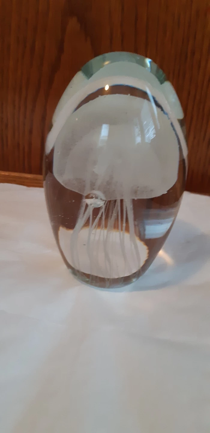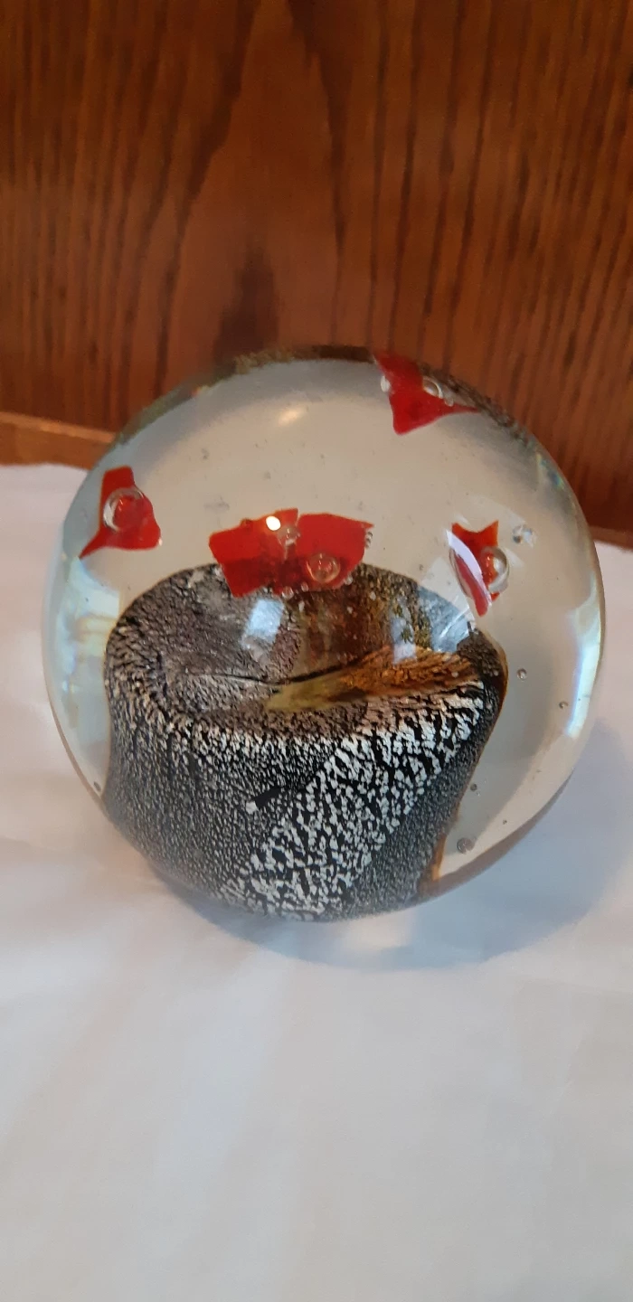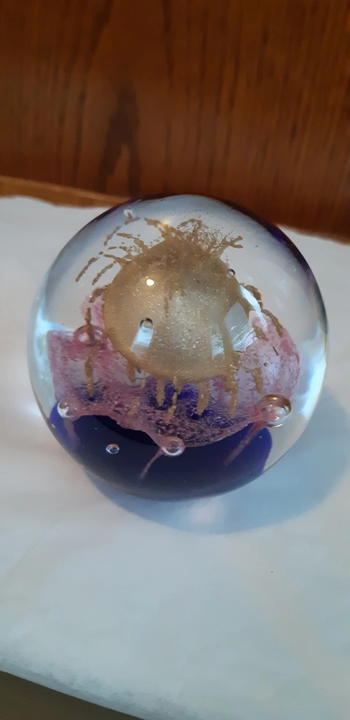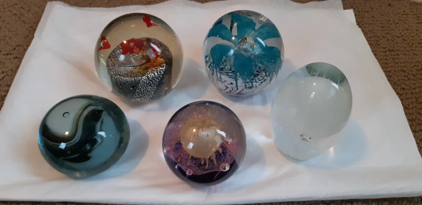 This is a collection of 5 beautiful glass paperweights. Each one is handmade and features a unique design.