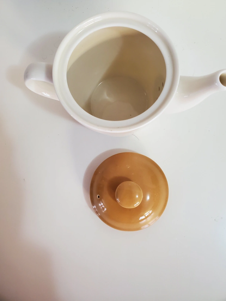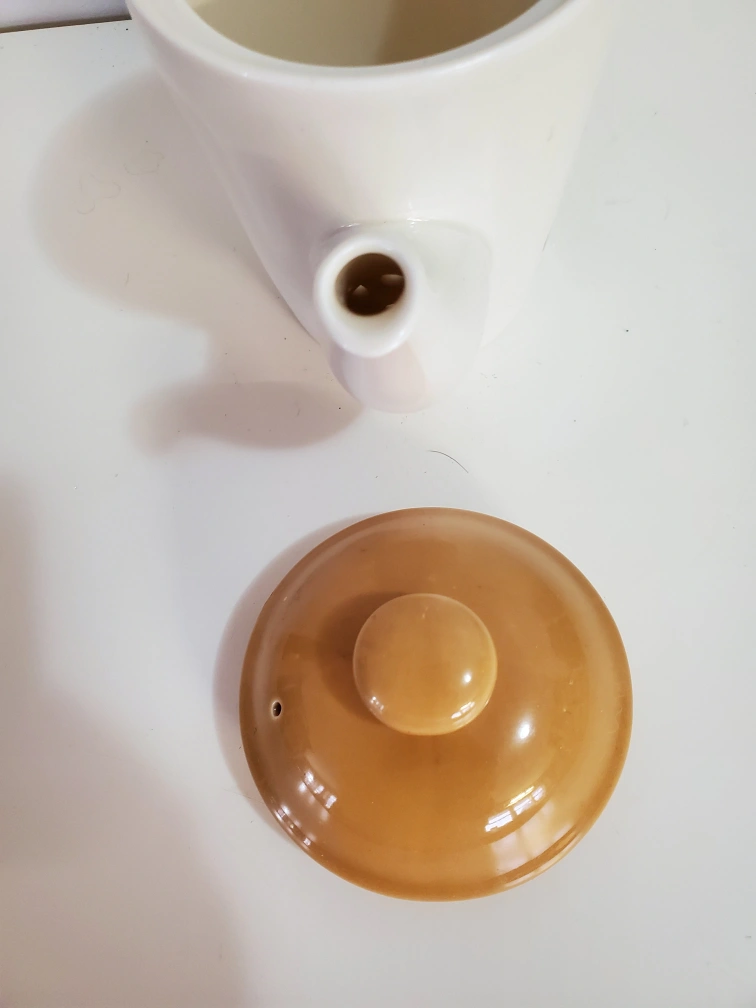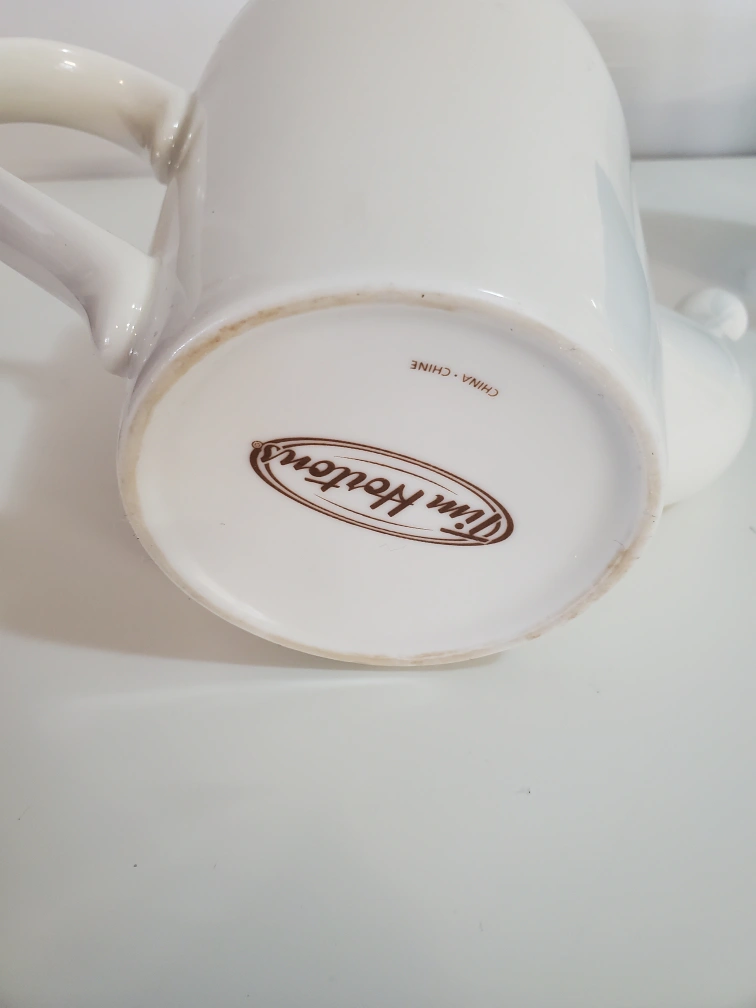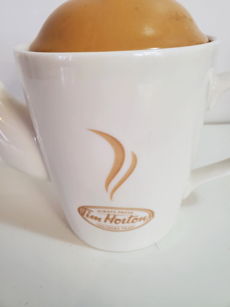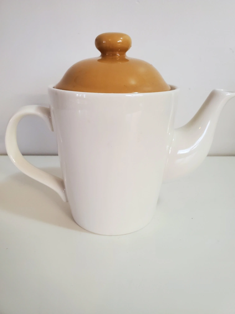 White ceramic teapot. Mustard yellow lid. Tim Hortons logo. Great for coffee or tea.