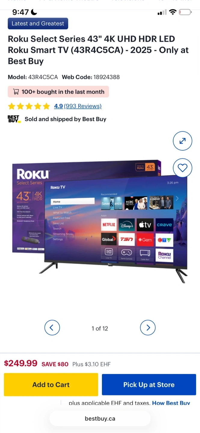 10Selling a Roku Select Series 43" 4K UHD HDR LED Roku Smart TV (43R4C5CA). Originally bought at Best Buy. Great for streaming all your favourite shows!