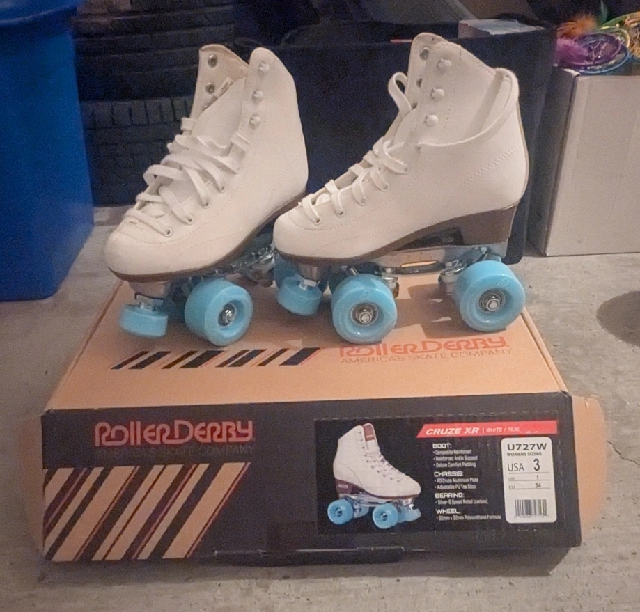 92Roller Derby Cruze XR roller skates in white and teal, kids size 3! The skates feature a deluxe comfort padding and an adjustable toe stop. Comes with the original box! My daughter wore them maybe five times and mostly inside.