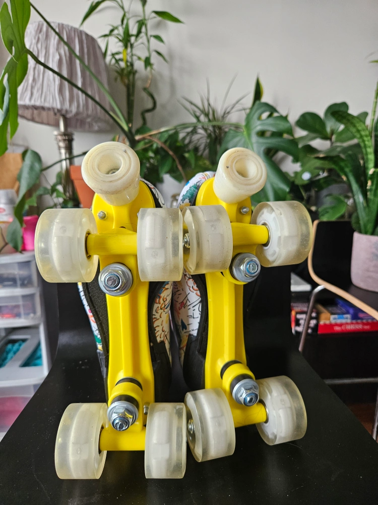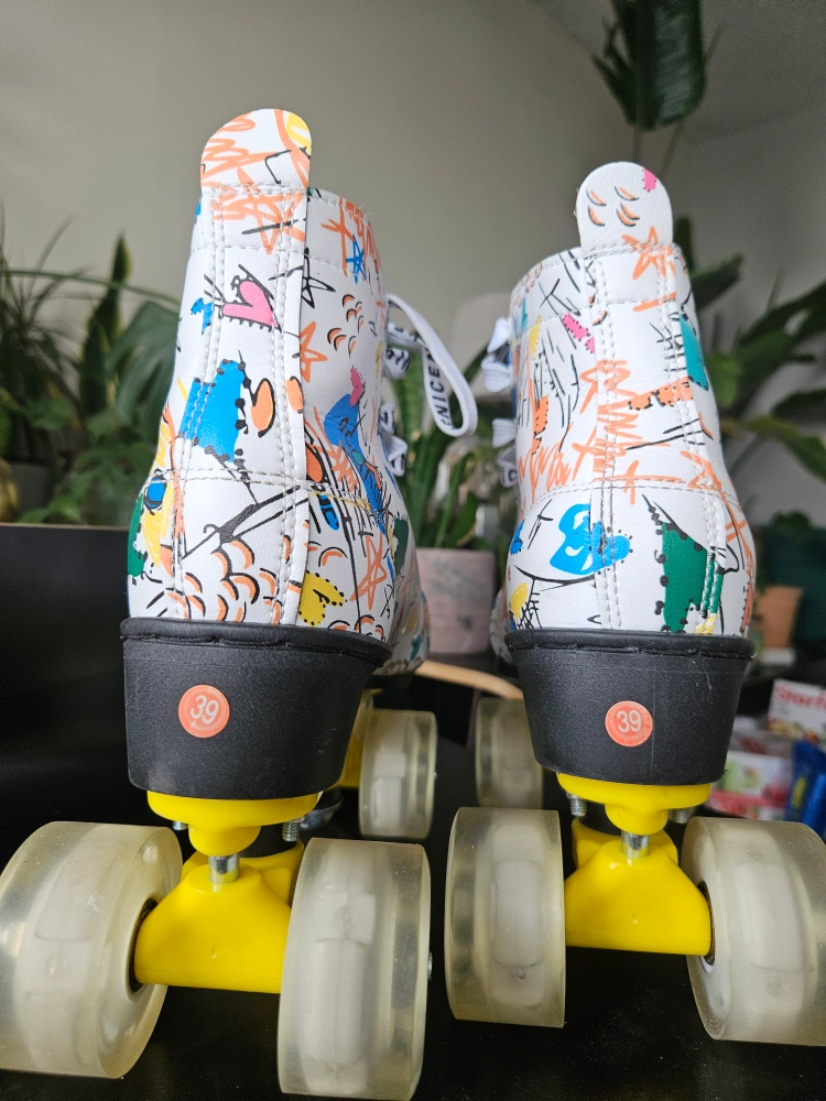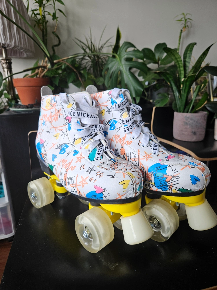 Selling a pair of white/"graffiti" skates with light-up wheels in size 39/8.5. Also included: - Black roller skating helmet with a little bull design on the front - 2 extra wheel bolts and adjustment tool - Skates bag and protective sleeves for the skates Both items only used once and are in excellent condition. I am unable to show the wheels lit as they do so when in use. Skates were $145 alone and helmet was $30.. asking $120 for all OBO. For pick-up, please.