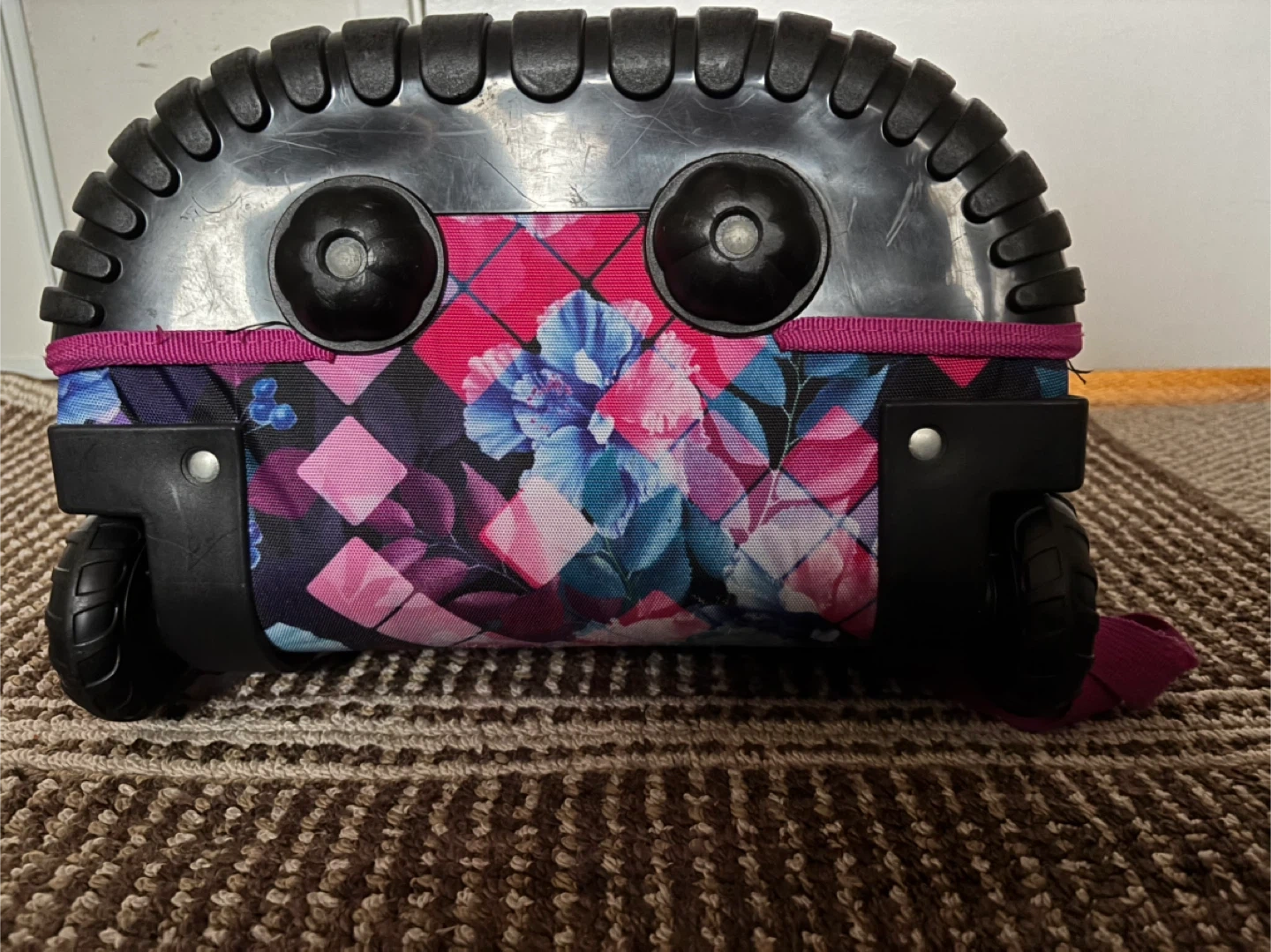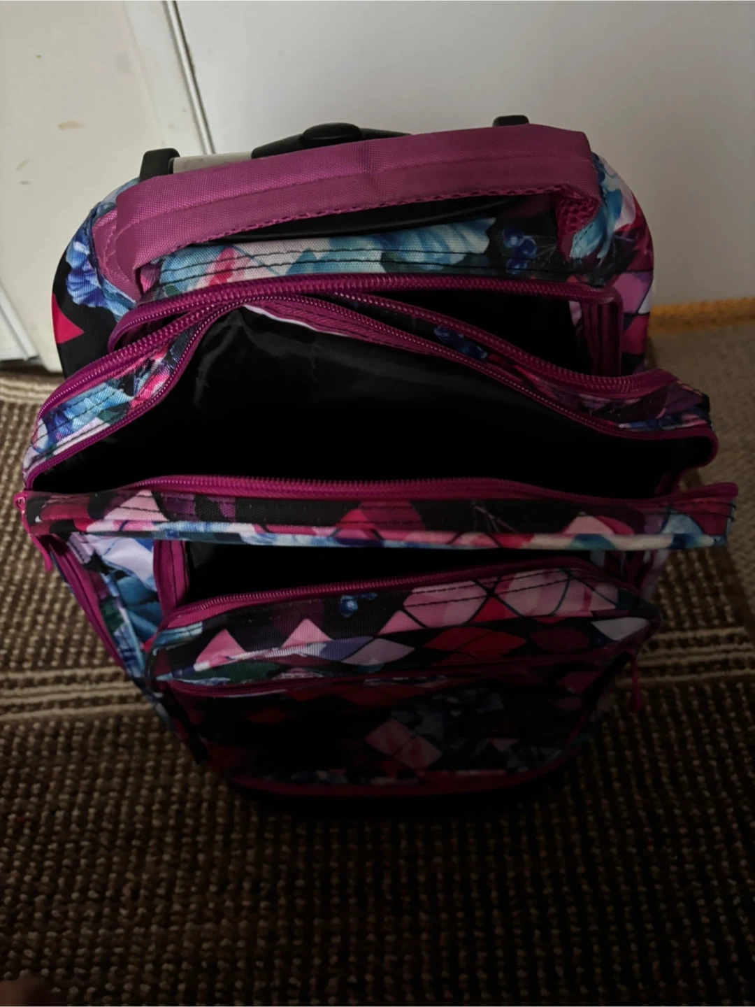 10This rolling backpack features a vibrant floral design with pink and blue accents. It has multiple compartments for easy organization and a retractable handle for easy rolling. Perfect for school or travel! I need it gone ASAP!!