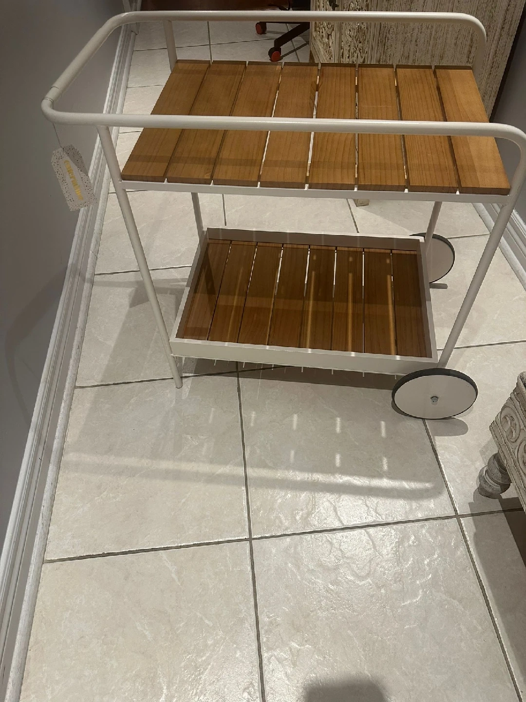 17Selling a rolling bar cart with wooden shelves. It's in great condition and perfect for serving drinks or displaying items in your home. The cart features a sturdy metal frame and smooth-rolling wheels for easy mobility. It's a stylish and functional addition to any space! 45x75x75 cm