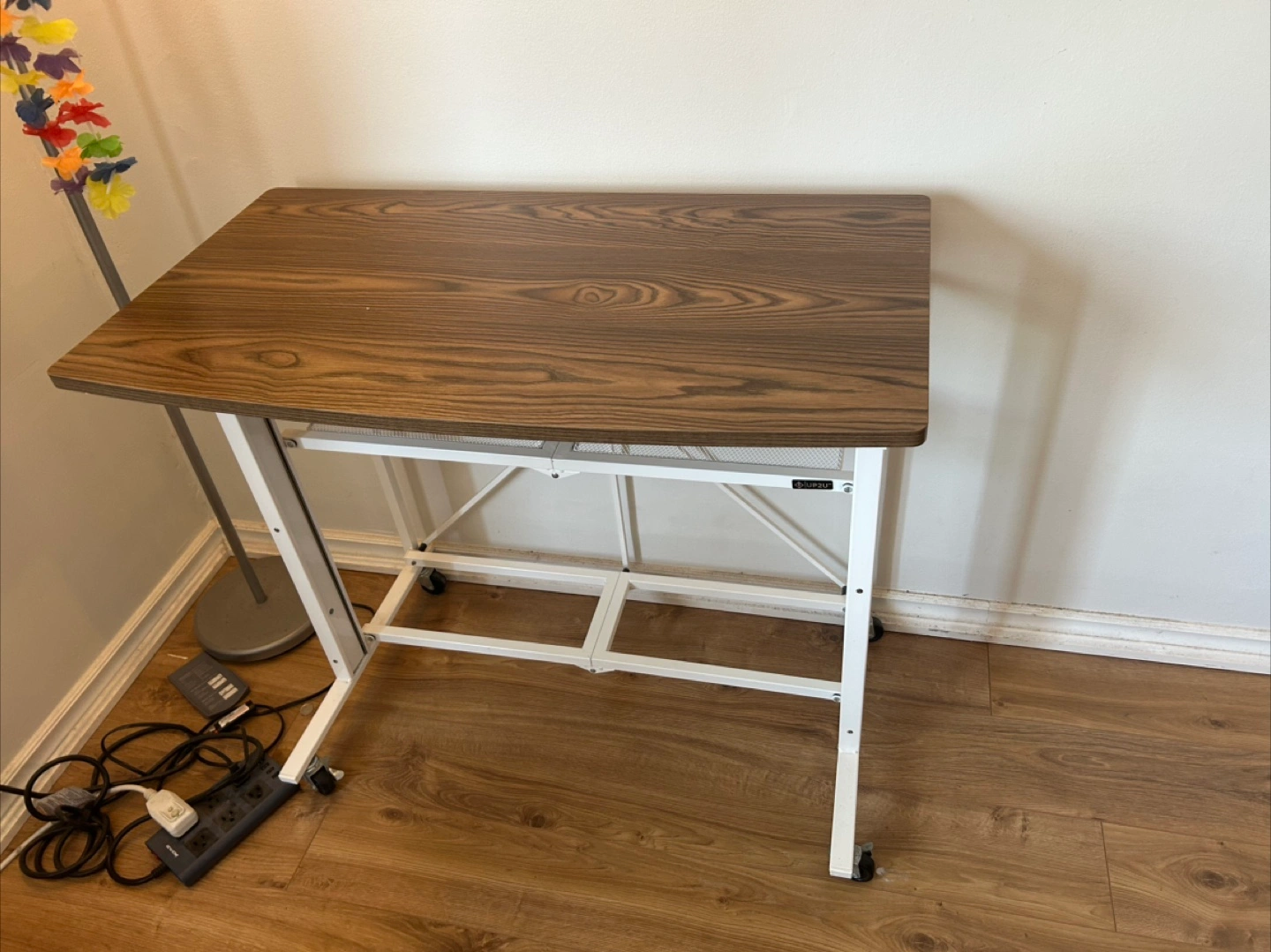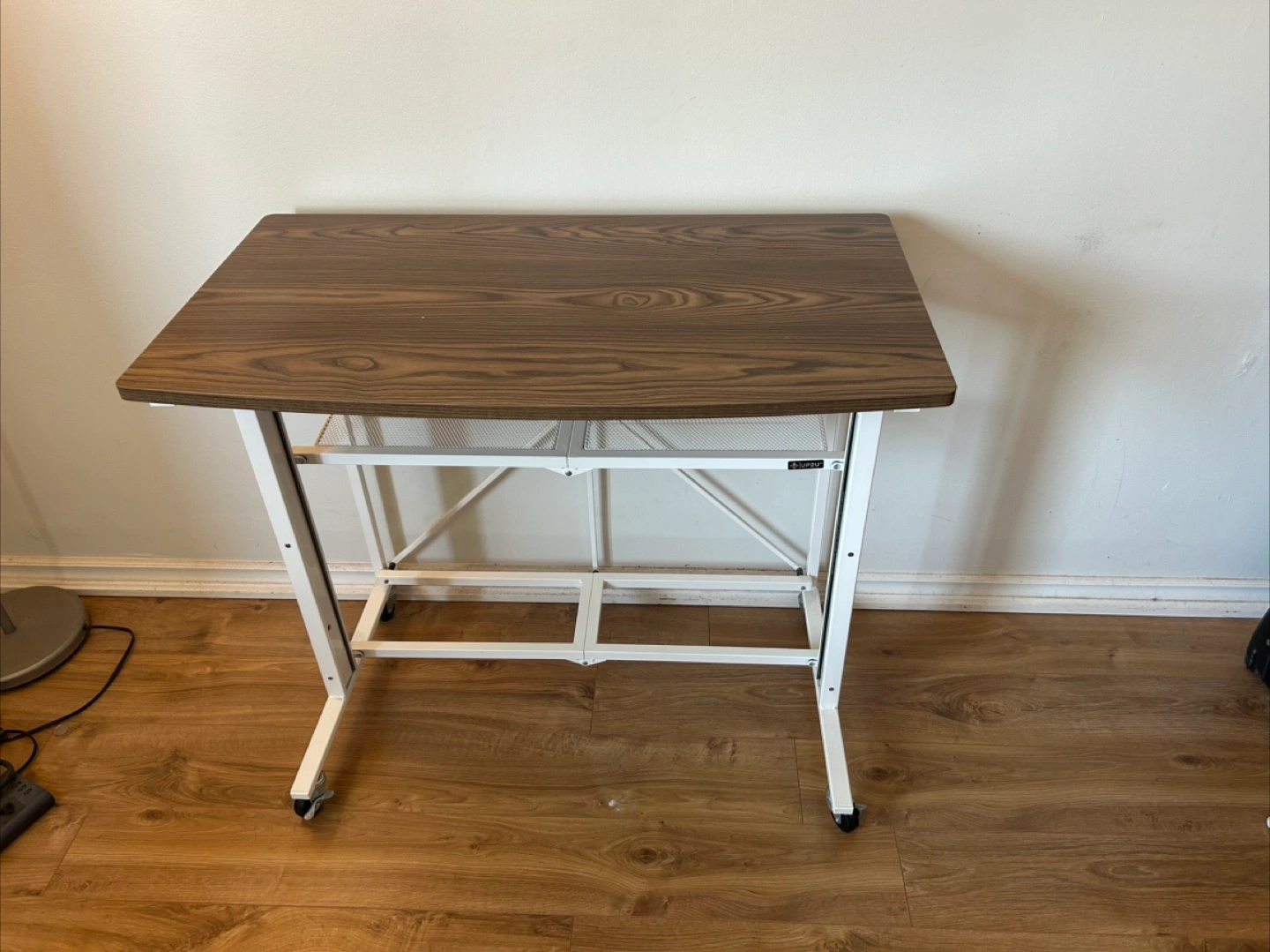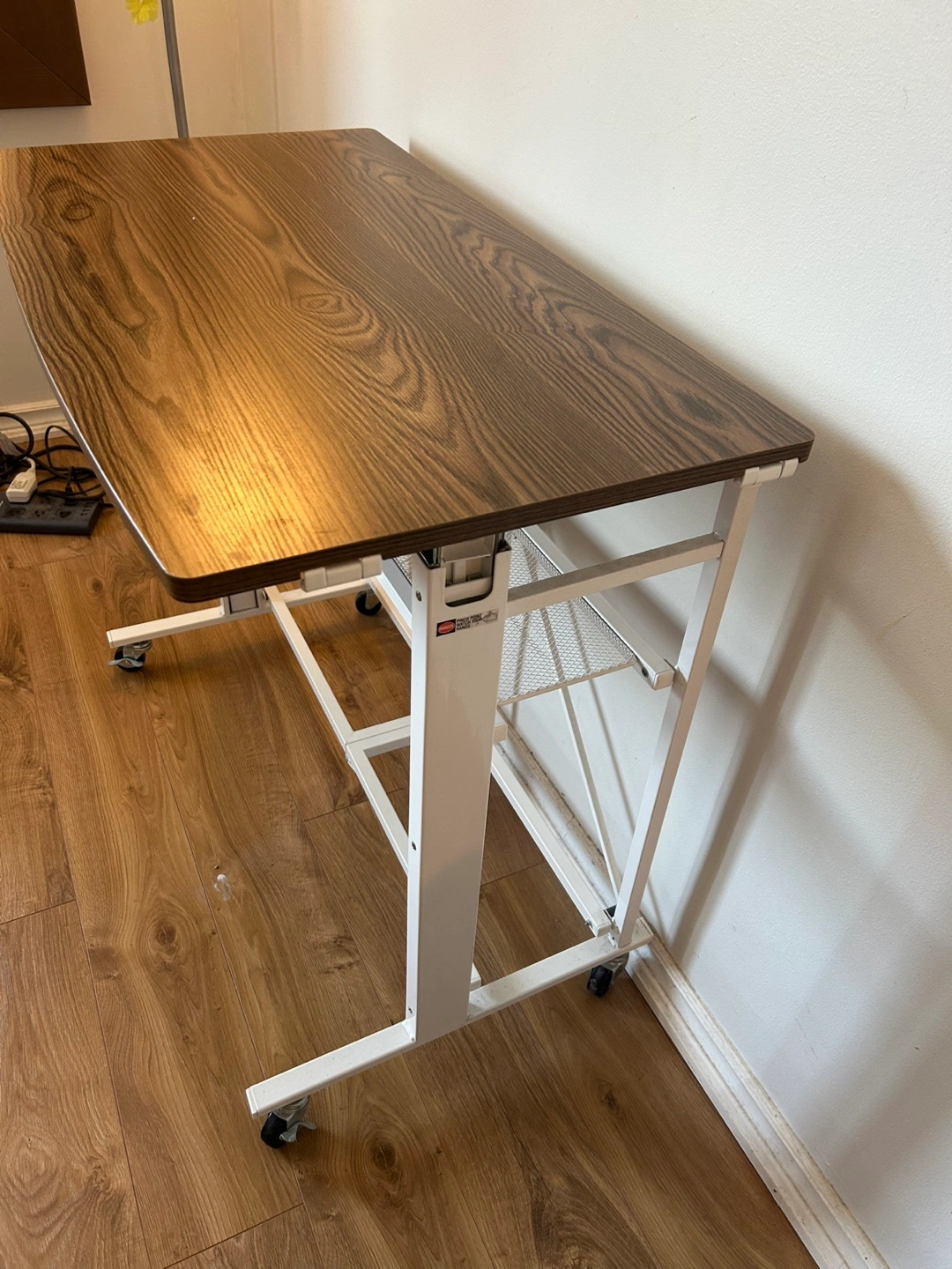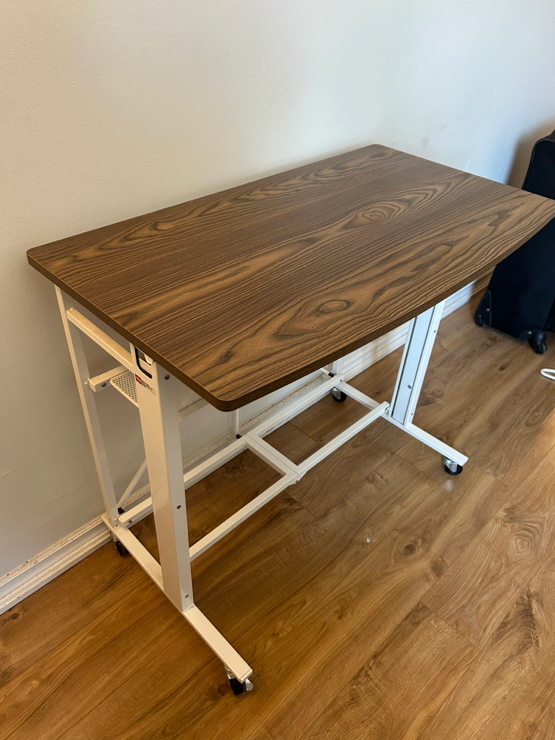A rolling desk. Features a brown wood-like top with a white frame. Includes a storage shelf. Makes a fine addition to a study space, perfect for journaling or working on creative projects.