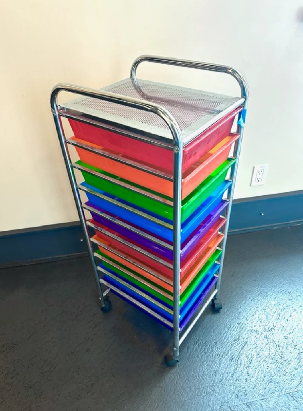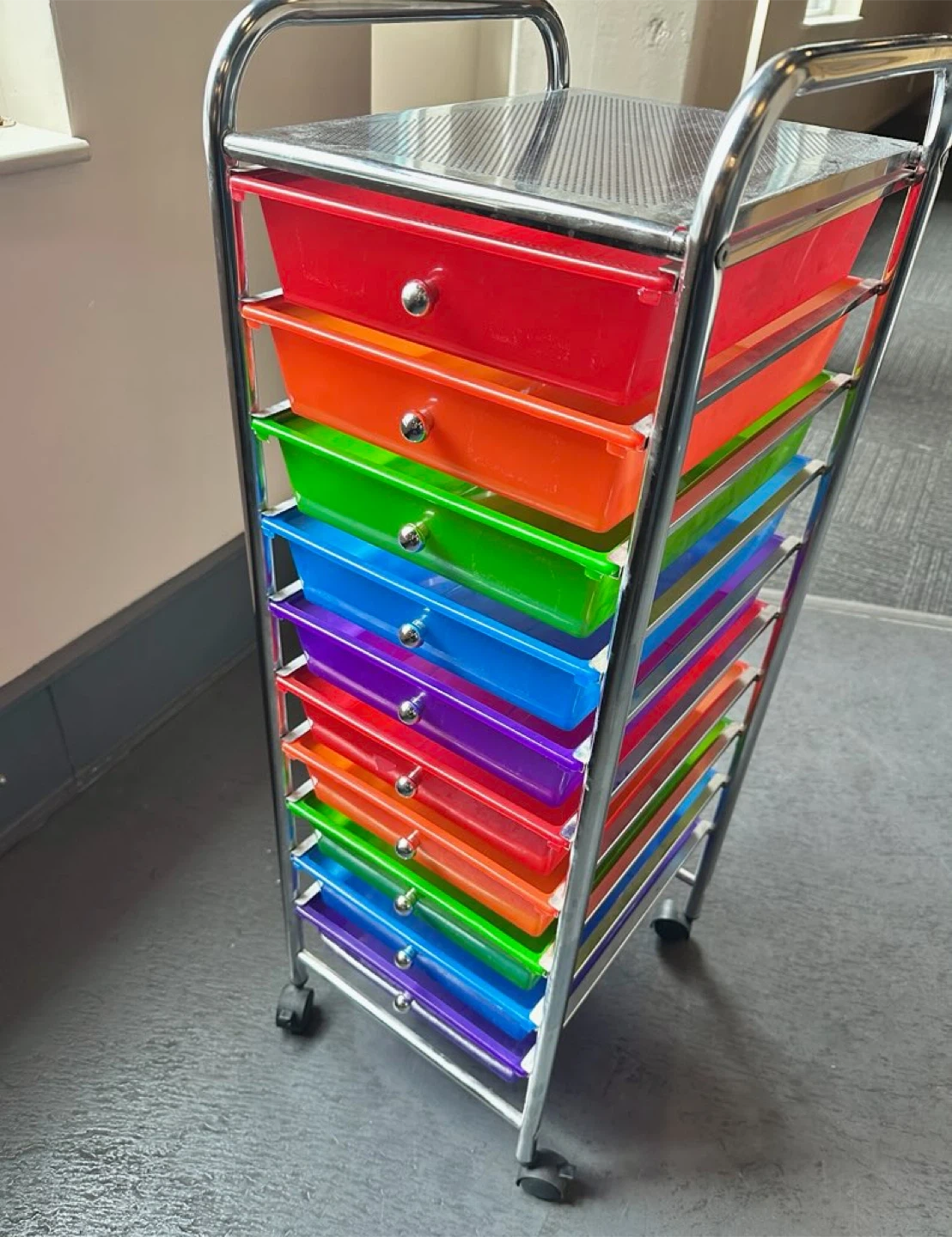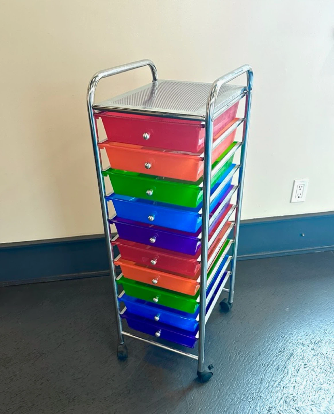 Here's a handy rolling cart with ten colourful drawers! Great for organizing art supplies, office materials, or anything else you need to keep tidy. The cart has a chrome frame and smooth-rolling casters, making it easy to move around