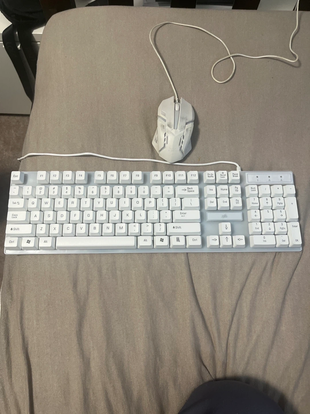 This is a white wired keyboard and mouse set. They're designed for gaming with a sleek look. The keyboard has a standard layout and the mouse is ergonomically shaped.