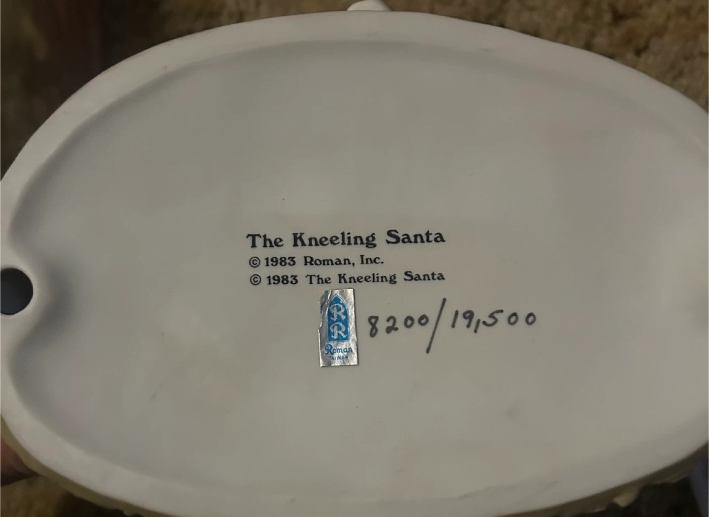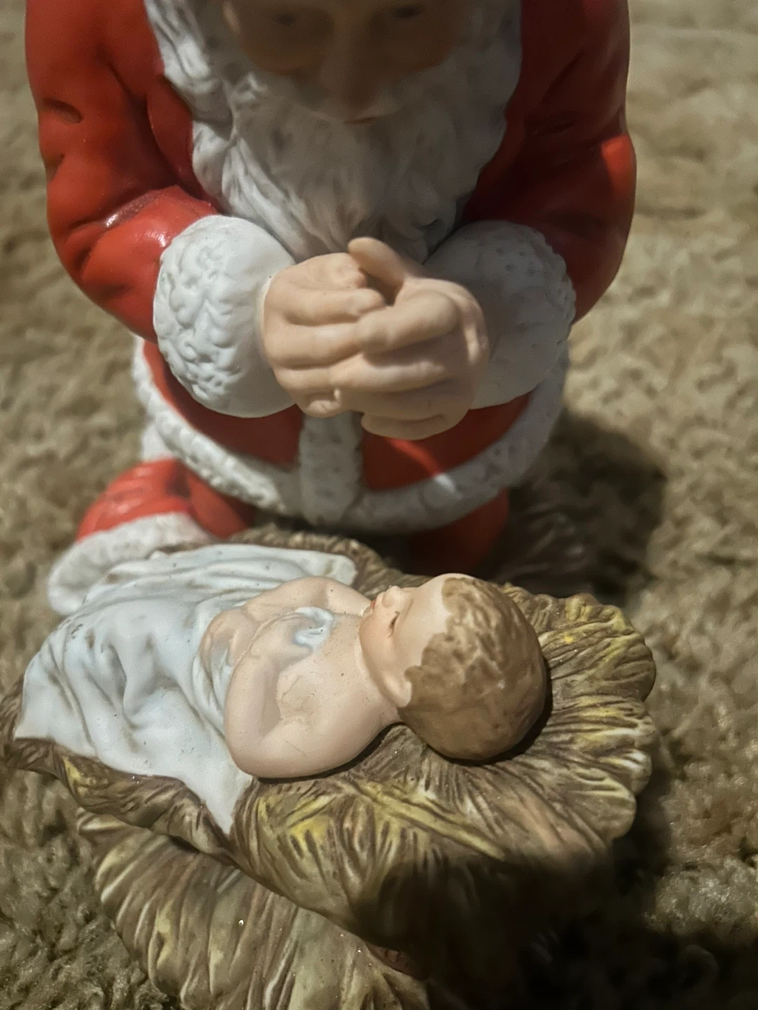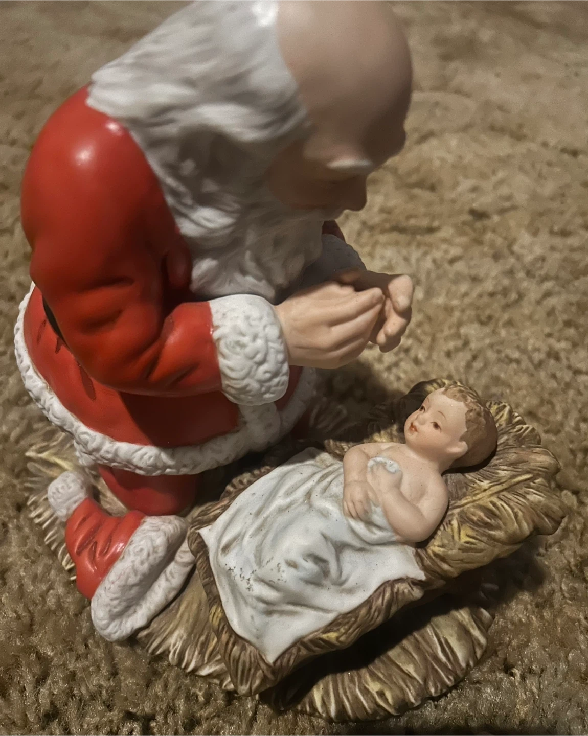 153From 1983 . I'm selling a Kneeling Santa figurine by Roman, Inc. This piece depicts Santa kneeling before baby Jesus. It's a beautiful addition to any Christmas display!