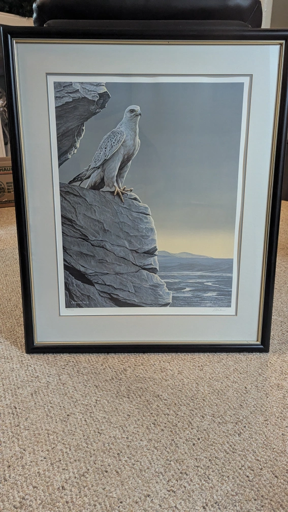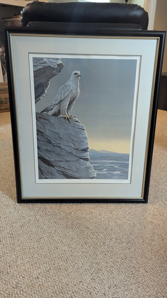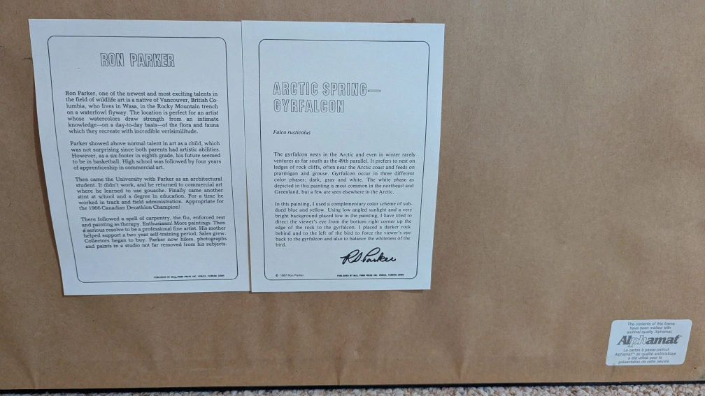 This is a framed print of a Gyrfalcon in the Arctic Spring, by the artist Ron Parker. The print is in excellent condition and professionally framed.