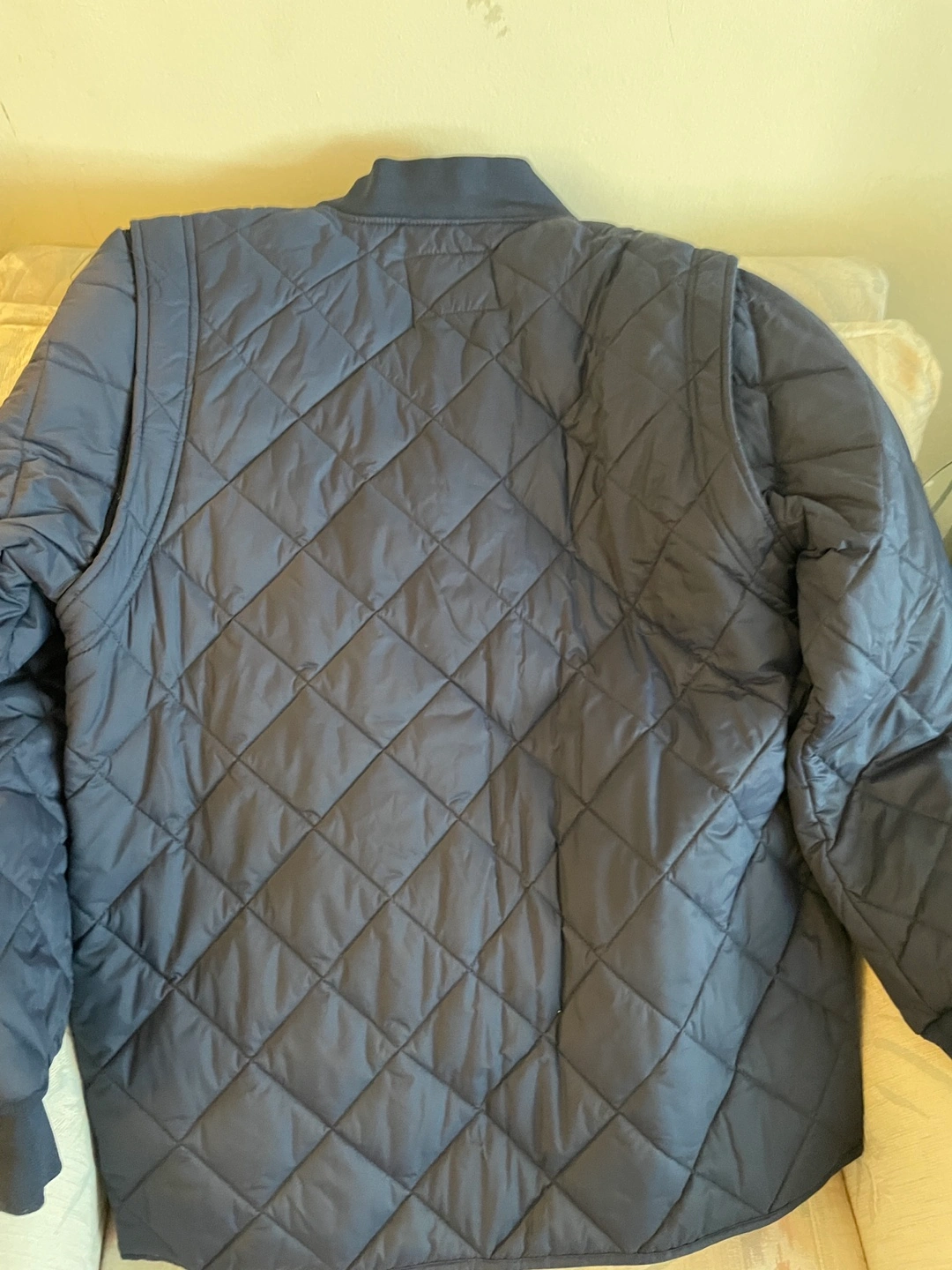 A dark blue bomber jacket with a quilted design. Features a zipper closure and two front pockets. It is a perfect piece for casual wear.