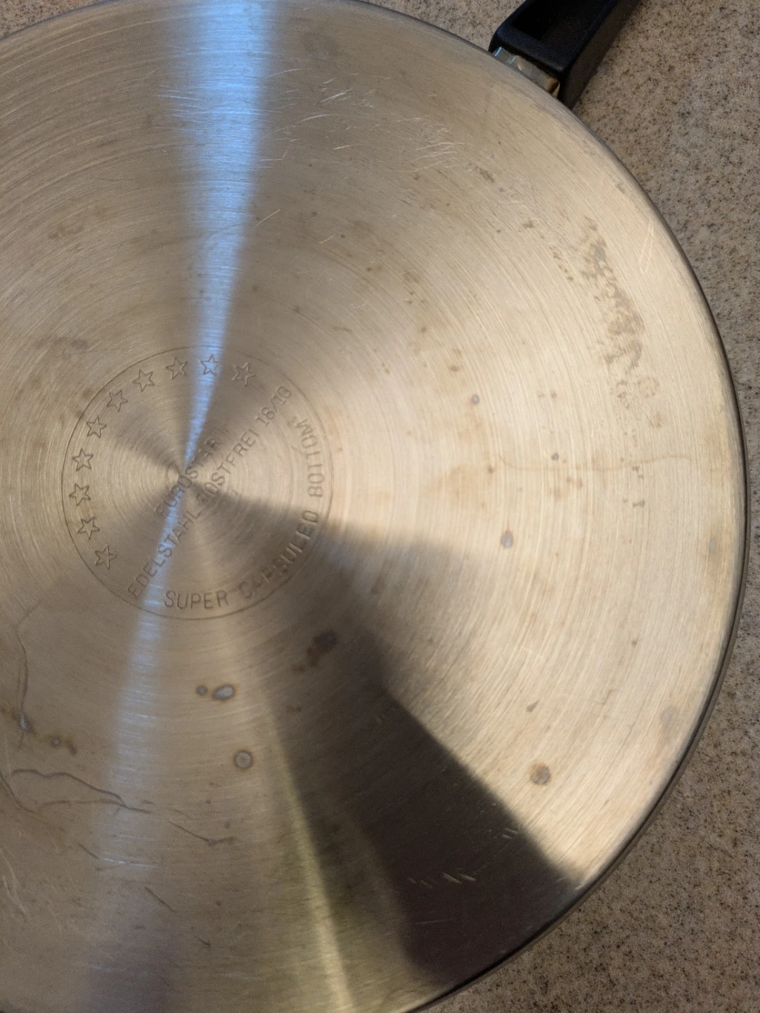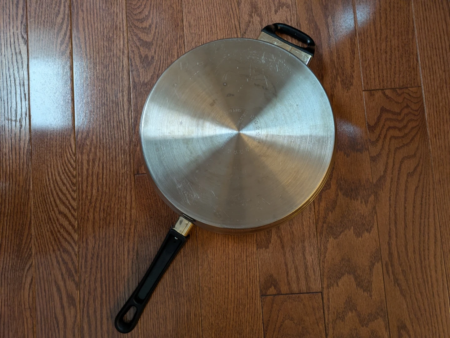 This Super Pan frying pan is made of stainless steel. It has a durable handle for a comfortable grip. The bottom measures 28cm.