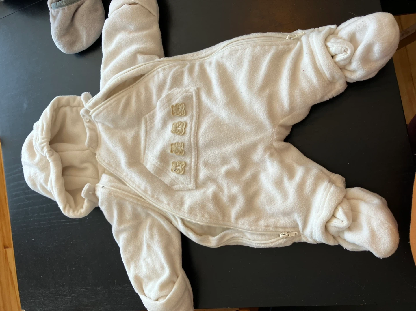 This cozy cream fleece snowsuit is from The Children's Place. It features a full zip front and attached hood. There are cute bear appliques on the chest pocket. The attached feet keep little toes warm!