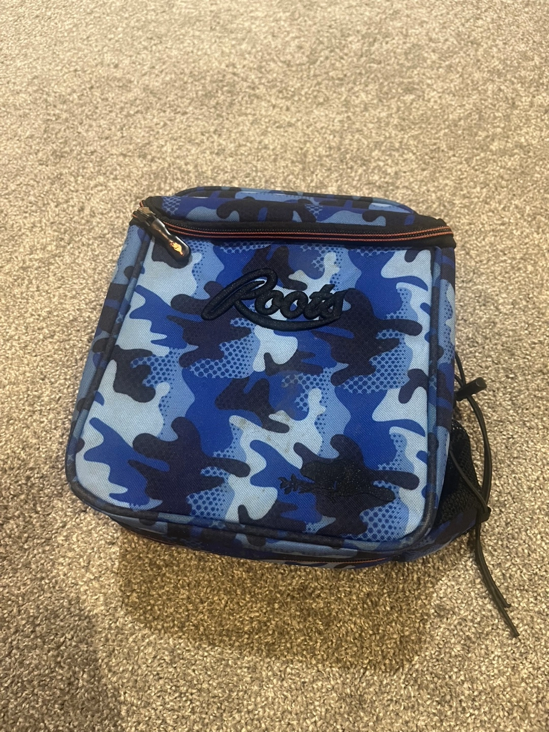 Roots lunch box in a blue camouflage pattern. It's in great shape and ready to keep your lunch cool! The interior is insulated and easy to clean. Perfect for school, work, or picnics