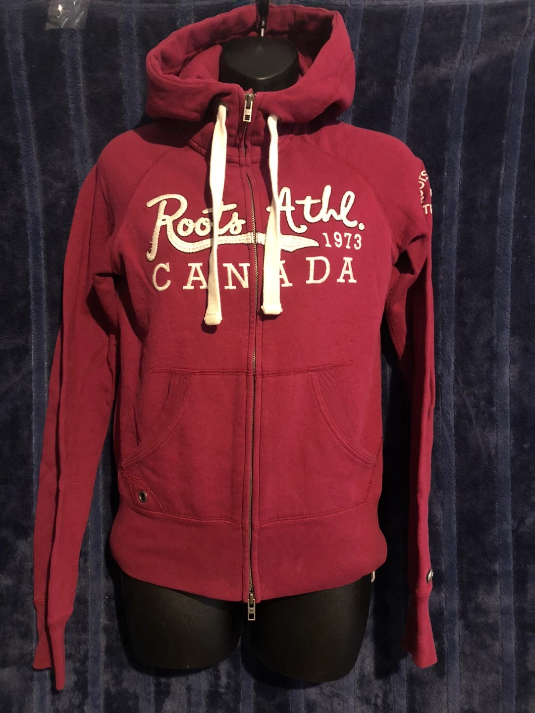 10Cozy Roots Canada hoodie in extra small. The colour is a lovely burgundy. Perfect for layering or wearing on its own!