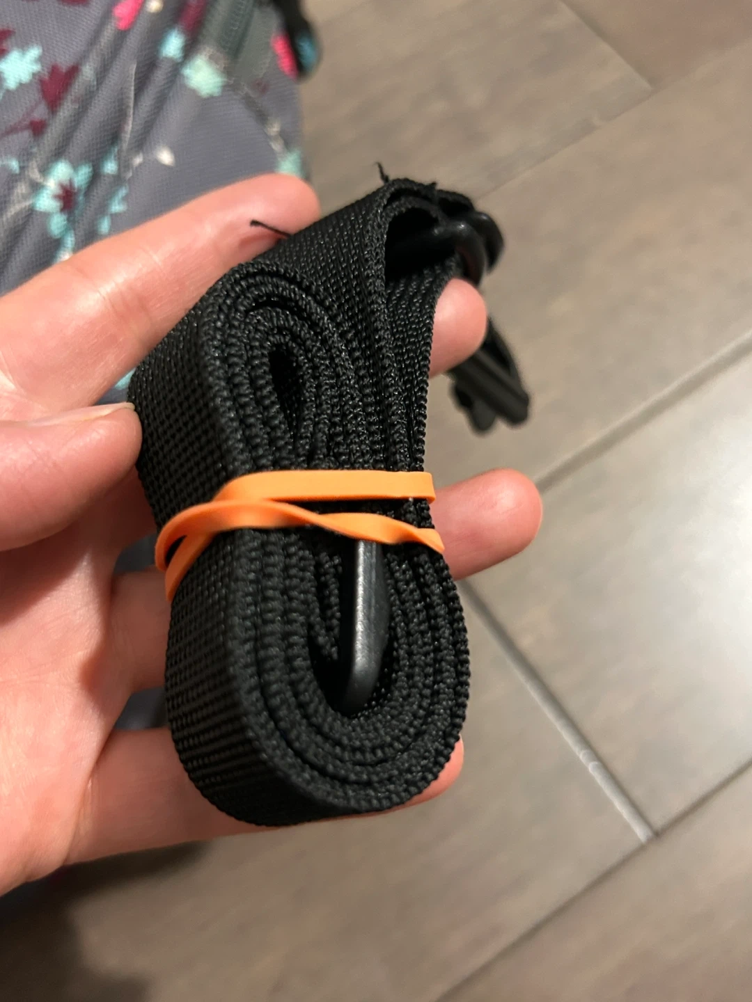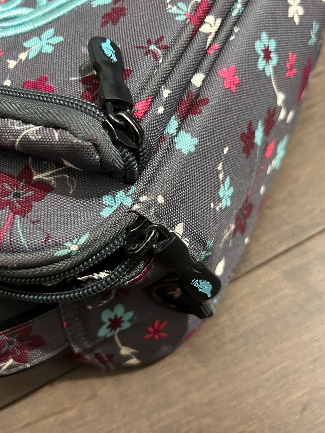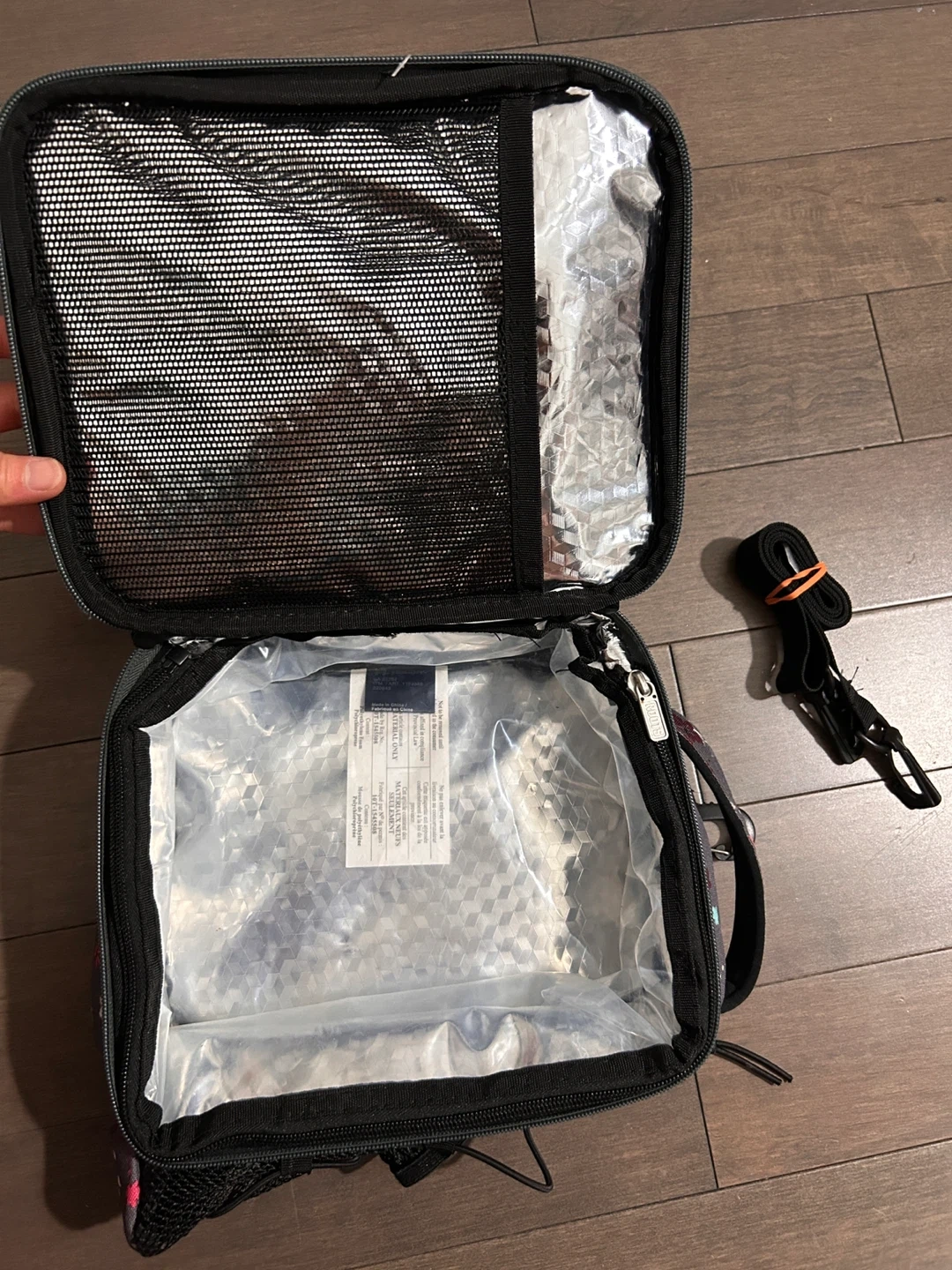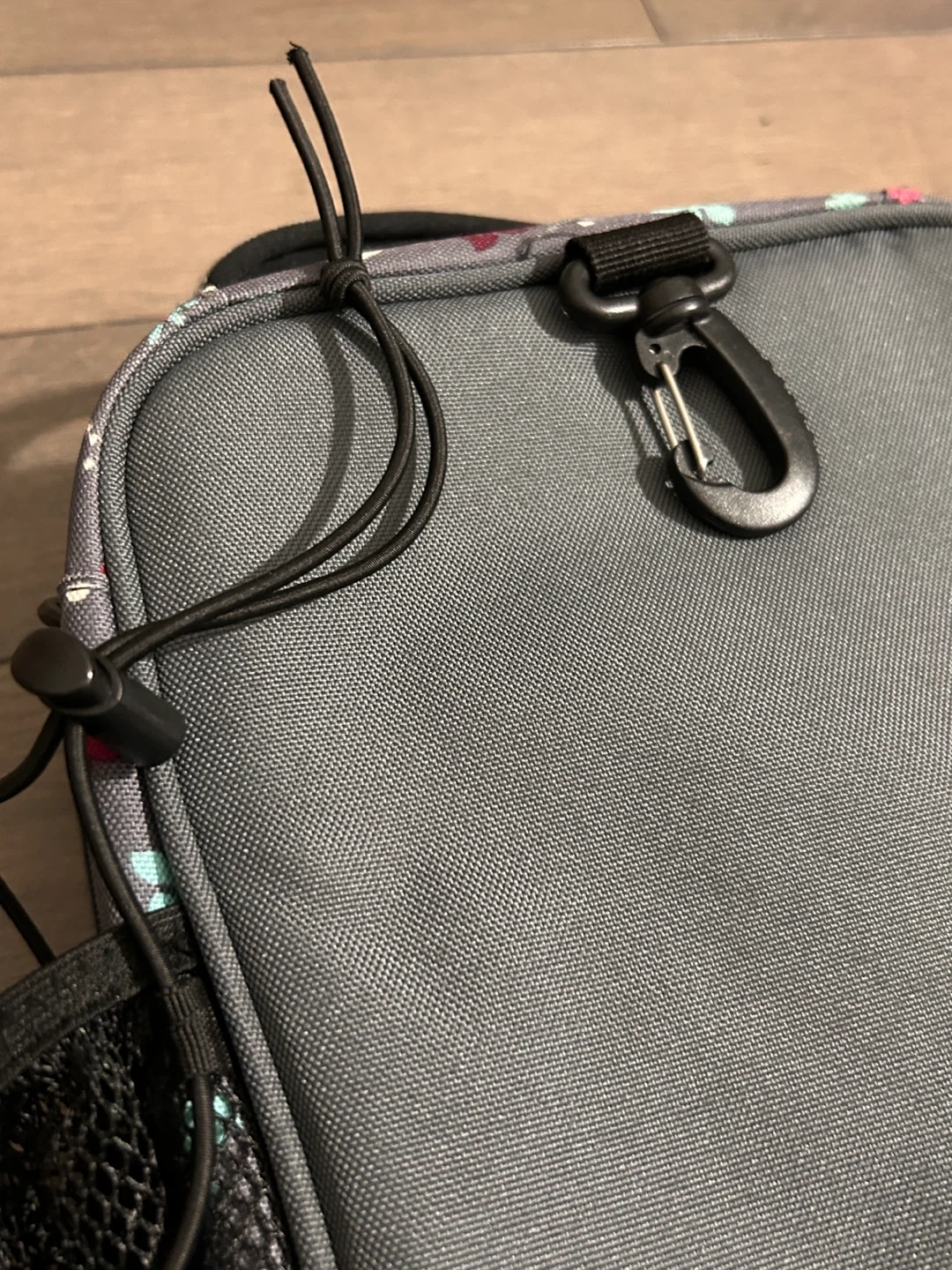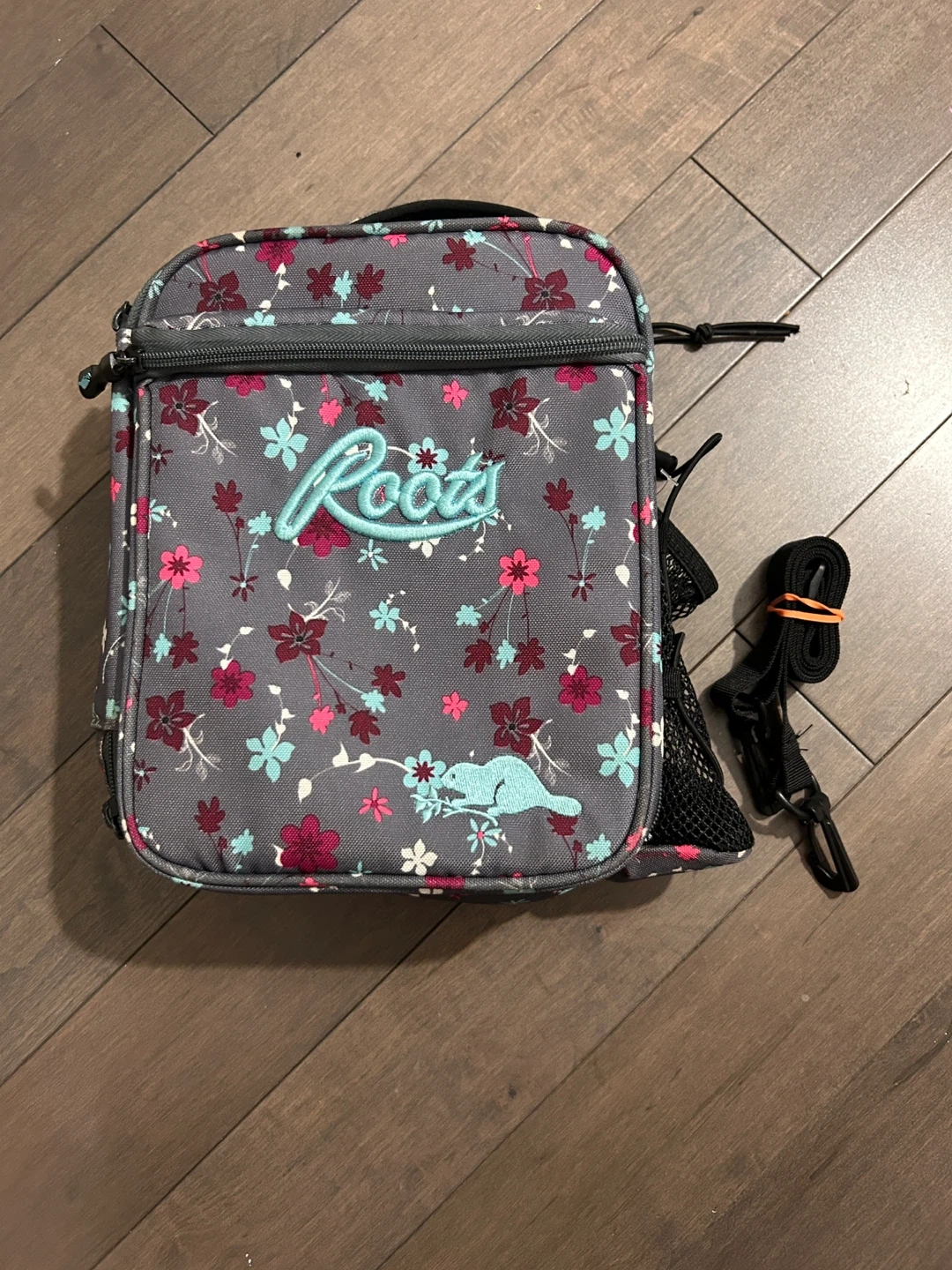 This Roots lunch bag features a pretty floral pattern on a grey background. It has a zipper closure and a mesh pocket inside. Comes with a detachable strap for easy carrying!