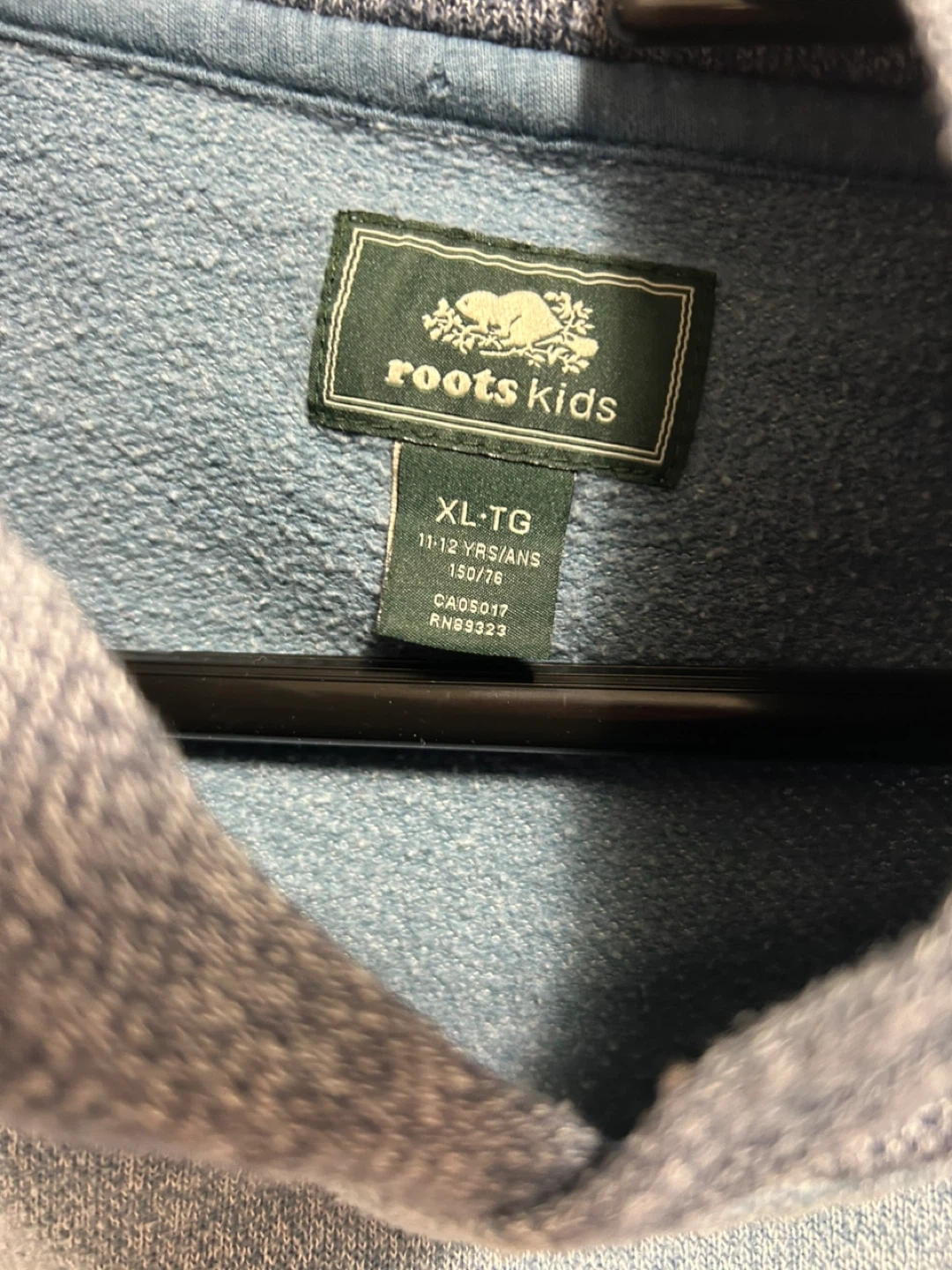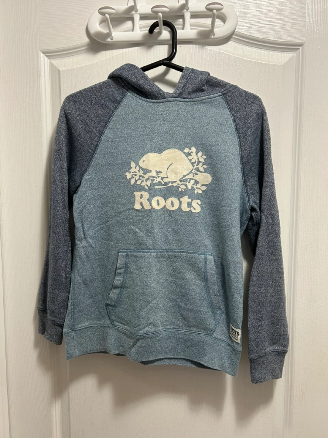 Roots Kids hoodie in good condition! It's a size XL, which fits kids aged 11-12 years. The hoodie is a lovely blue colour with grey sleeves and features the classic Roots beaver logo. Perfect for keeping your little one warm and stylish!
