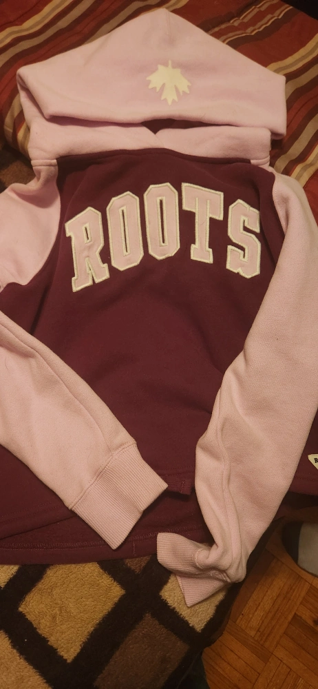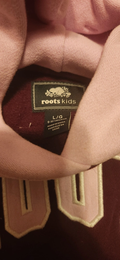 114This is a Roots Kids hoodie in maroon and pink with white lettering. It has a maple leaf on the hood and the Roots logo on the front. The hoodie is in size L/G.