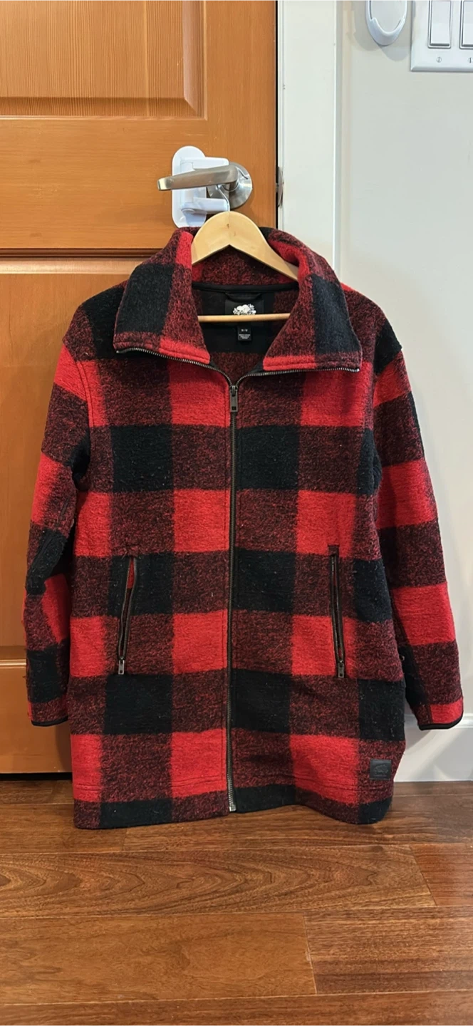 65Cozy up in this stylish Roots jacket! It features a classic red and black plaid pattern and is made from a warm wool blend. Perfect for those chilly Canadian days. Size is M/M.