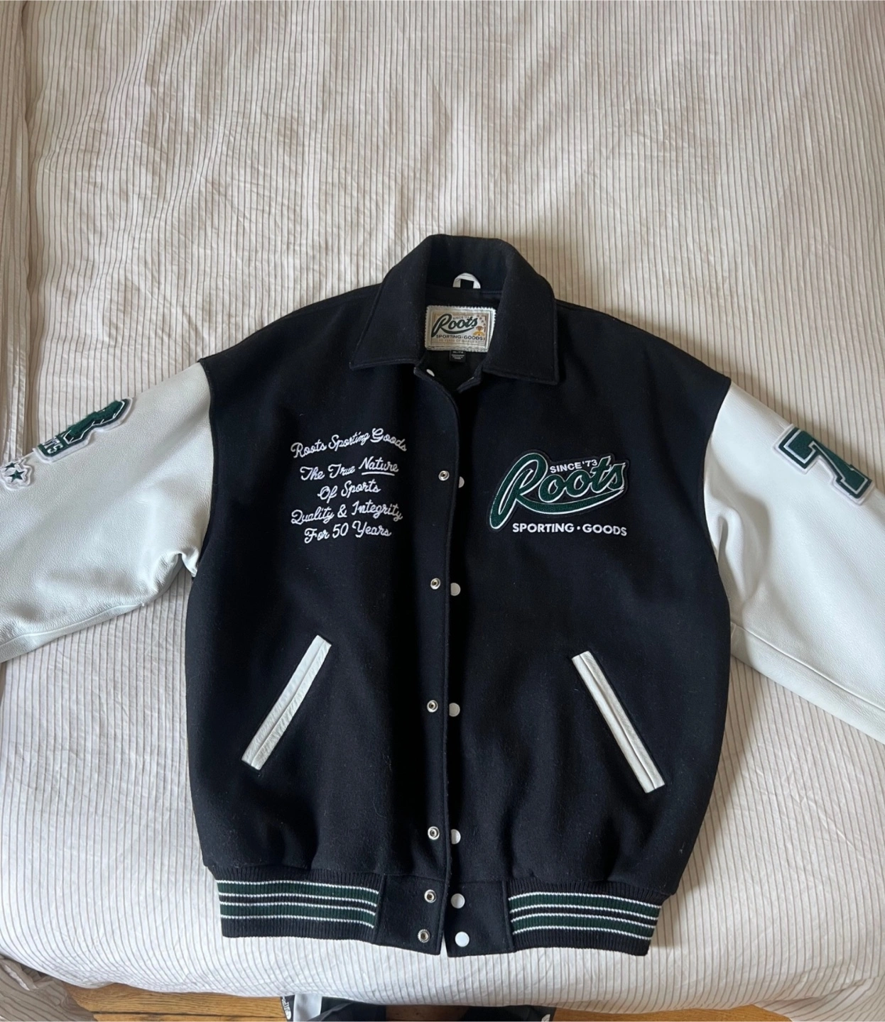 Black wool varsity jacket. White leather sleeves. Green and white details. Number 73 on sleeves. Roots logo and text throughout. Classic style.just worn twice, reason for selling? Because a bit big for me .. retail price 798$ before tax.