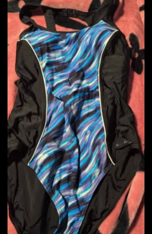 Roots Swim swimsuit in size 14. It features a black and blue patterned design. Perfect for your next trip to the pool or beach!