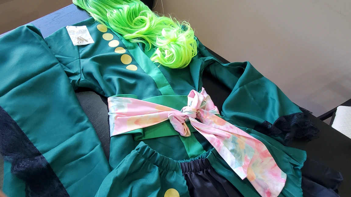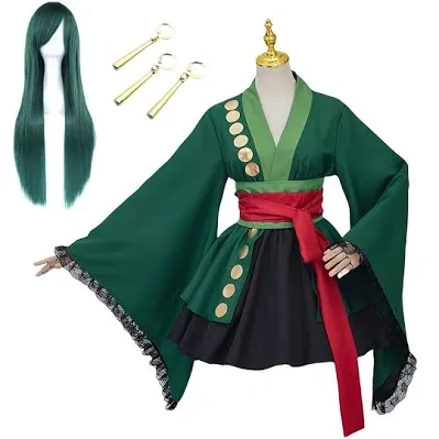 Roronoa Zoro cosplay costume! It's a green and black outfit with a pink and yellow floral sash. Includes the green wig and earrings. Perfect for any One Piece fan! new never used