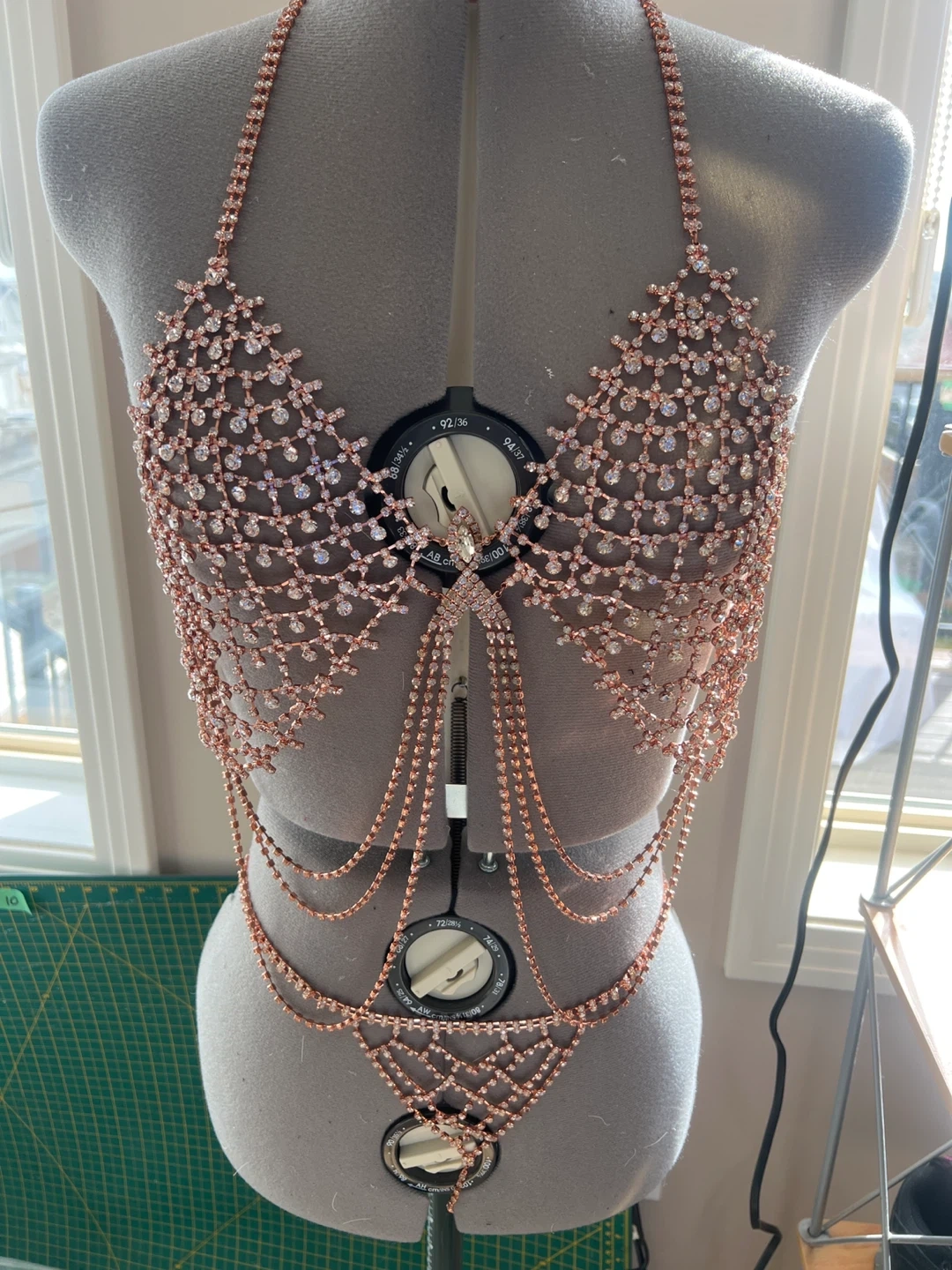 55Selling a sparkly rose gold body chain! It's in great condition and would be perfect for adding some bling to your outfit or glamour photo shoots. The rhinestones catch the light beautifully.