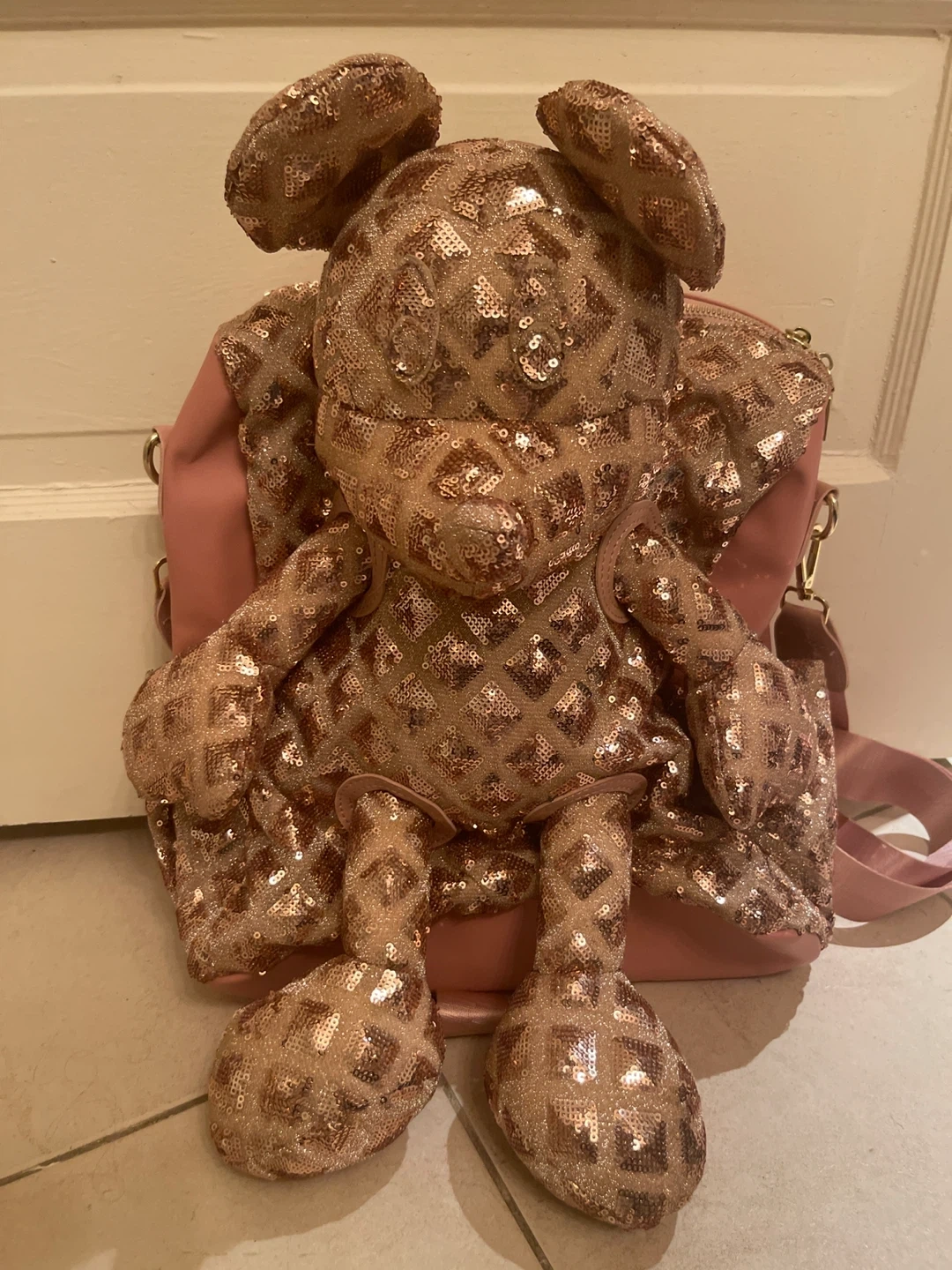 23This is a cute rose gold sequin bear backpack! It's in great condition and ready for a new home. The backpack is a light pink colour, with rose gold sequins covering the bear design. Perfect for adding a bit of sparkle to your day