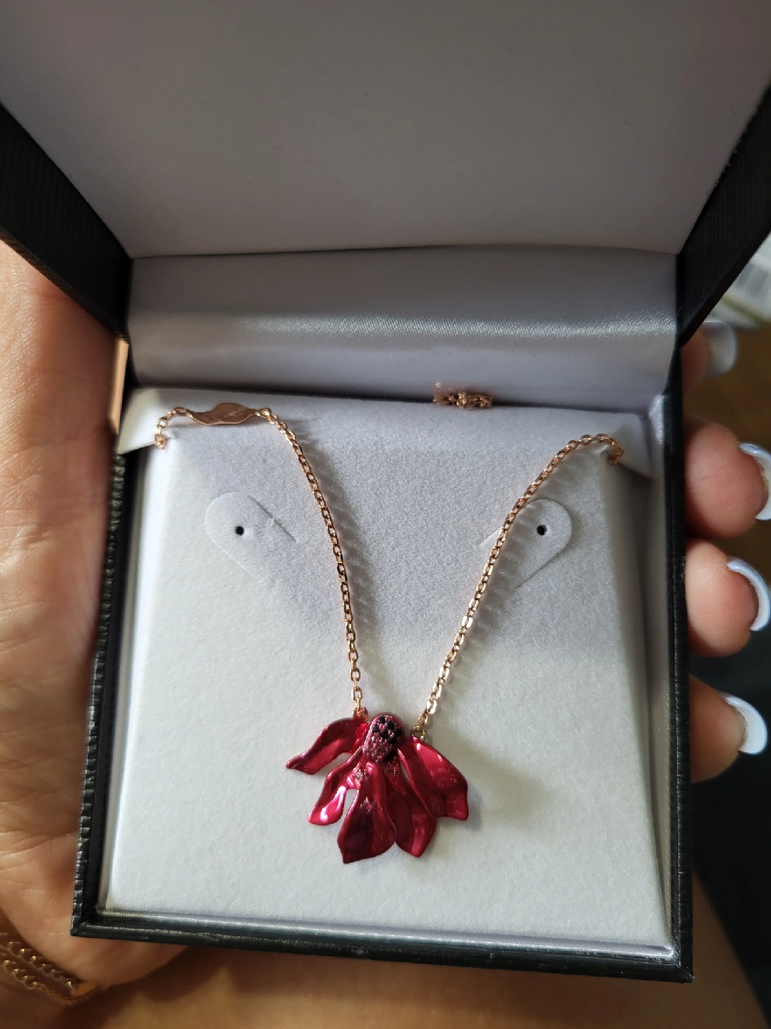 67A lovely silver necklace featuring a red flower pendant. It comes with its original box, making it perfect for gifting or keeping it safe. The necklace is in excellent condition and ready to be worn and enjoyed!